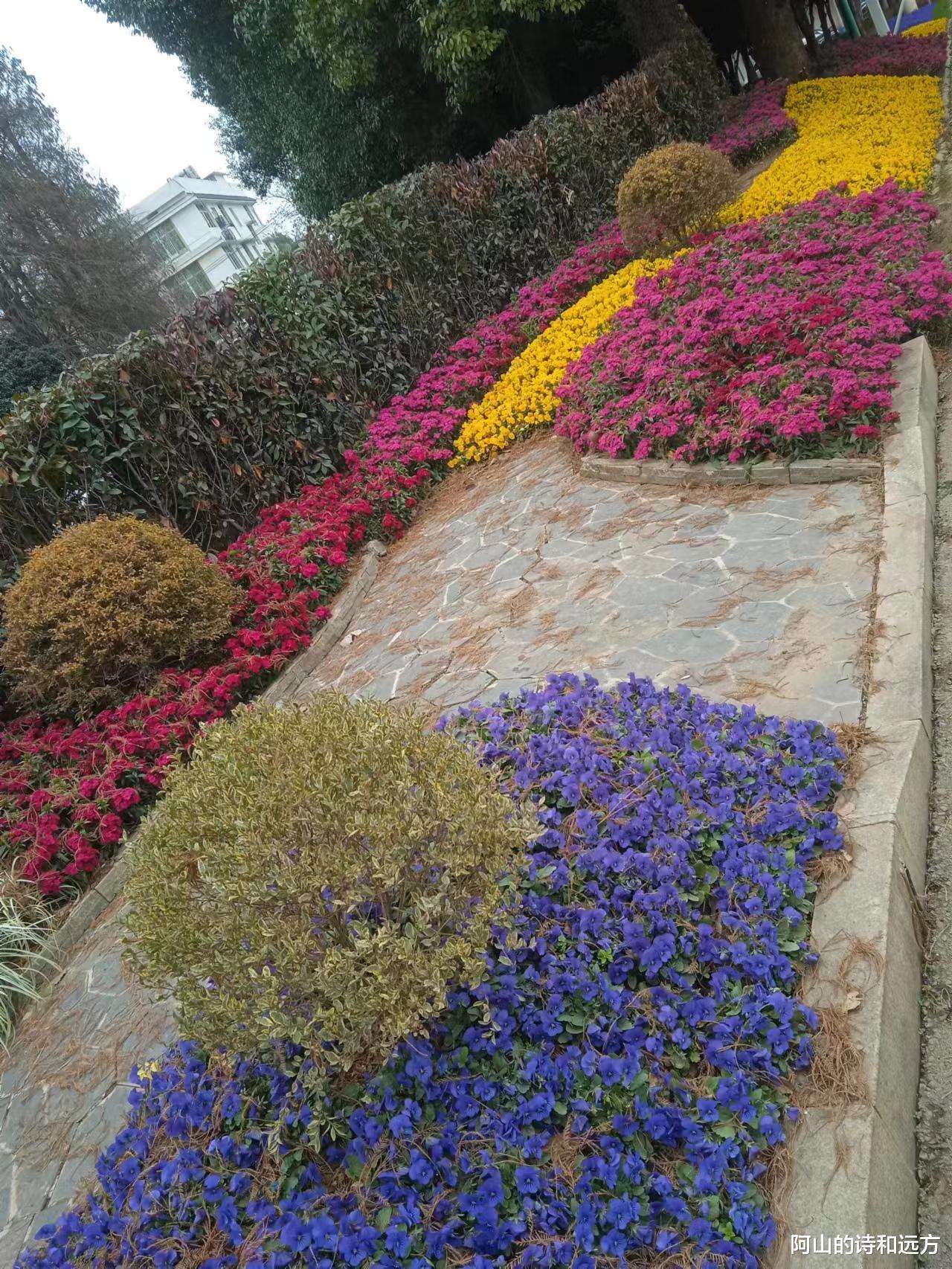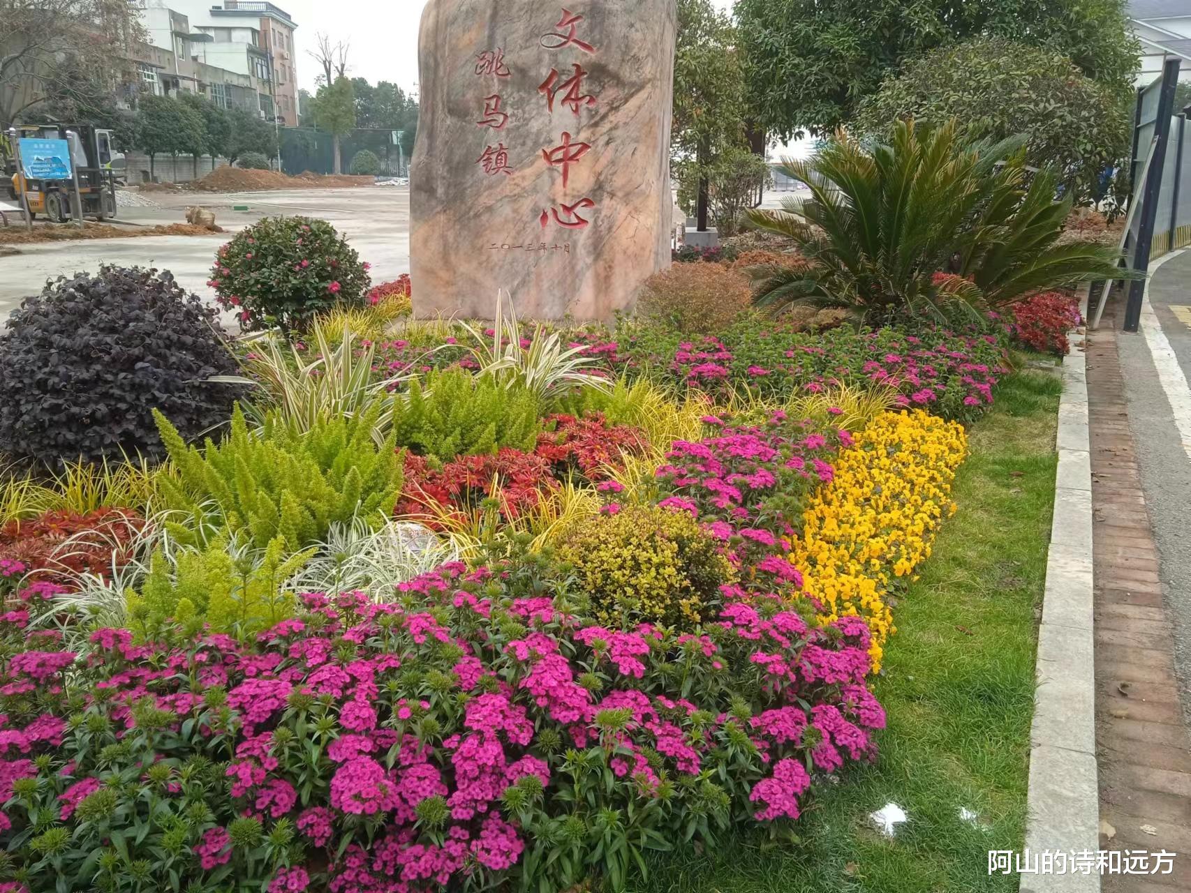 另一块石碑上有“跳马镇文体中心”的字样。花坛里种植了五颜六色的花草,各色鲜花开得正热闹。