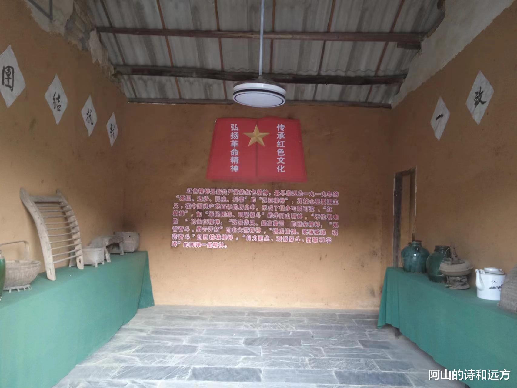 旧址的房屋门口,乡村公路边砌了一段外观像万里长城的城墙,房屋跟一般普通农家住房差不多,3间正房1间耳房,大门右侧摆放着一架风簸(去除谷米中糠秕杂物等的家具)、1台打稻谷用的拌桶,还有1件蓑衣、一个小的簸箕。