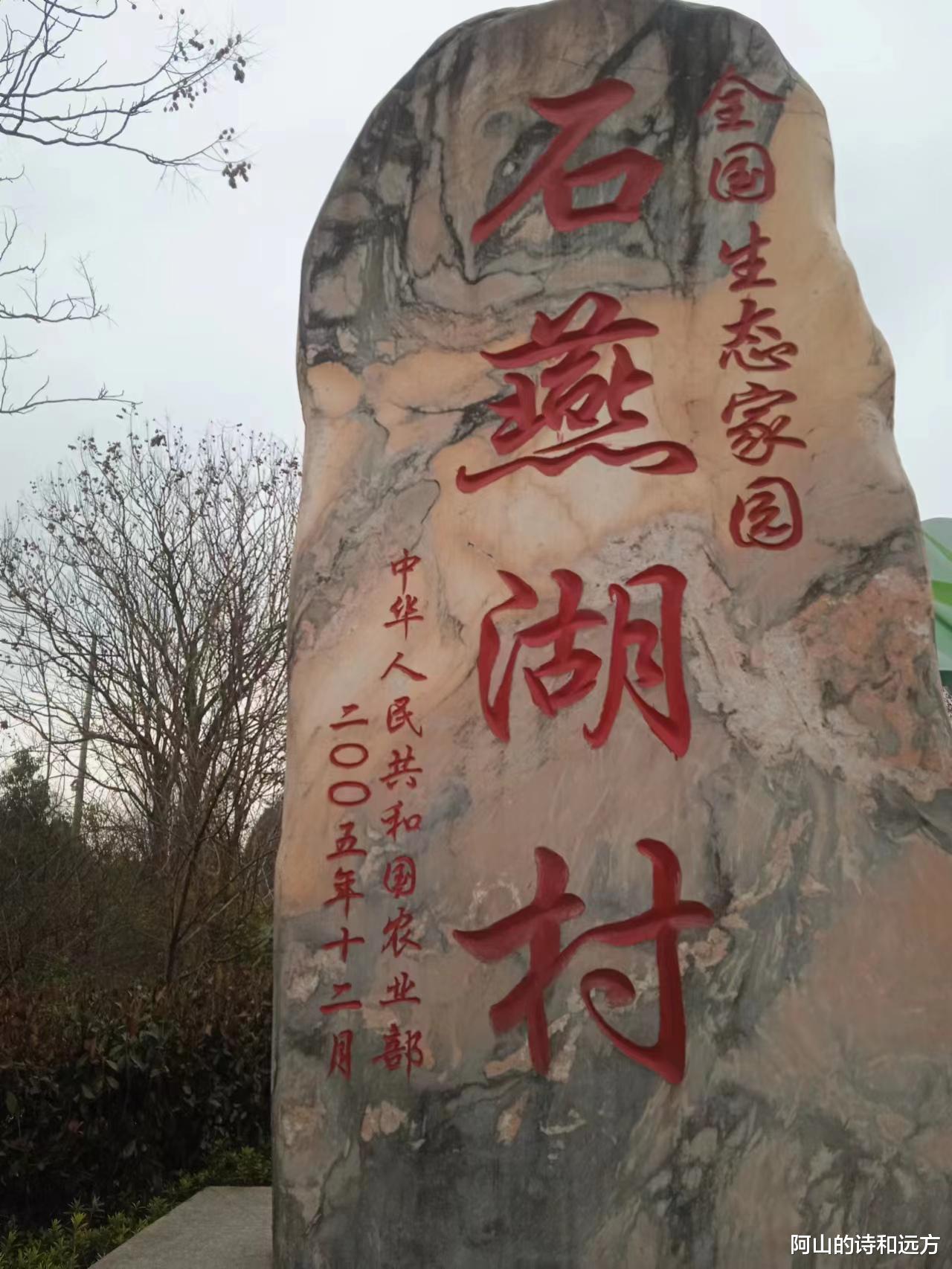 一块大石碑立在公路边,上书“全国生态家园 石燕湖村 中华人民共和国农业部 二OO五年五月十二日”的字样。