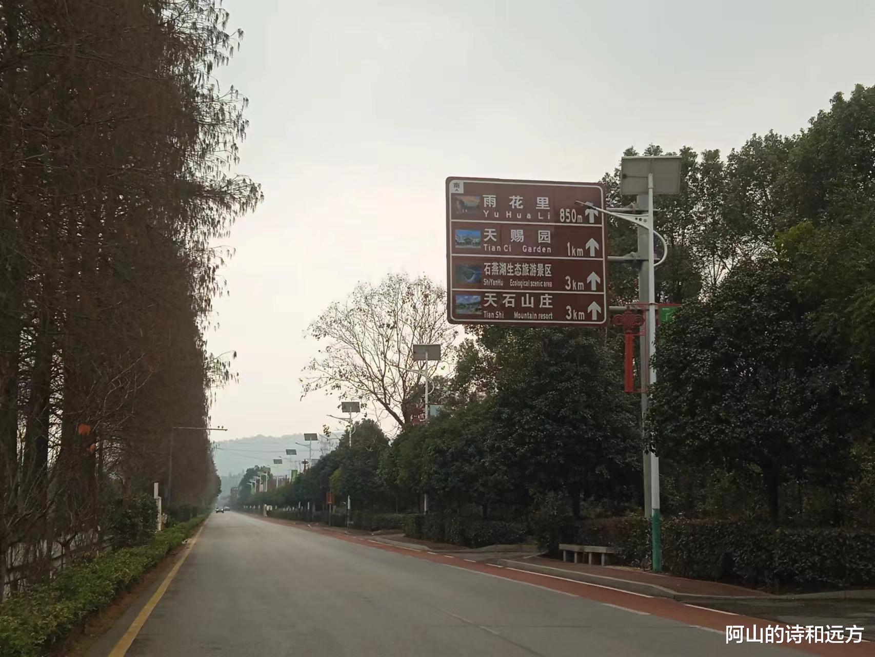 、笔直的石堰湖路边,路标上标明由近到远的几个地方:雨花里、天赐园、石堰湖生态旅游景区、天石山庄。公路左侧靠近圭塘河边是一排高大的枫树,枫叶已落了不少,留在树枝上的已是一片斑斓的黄。