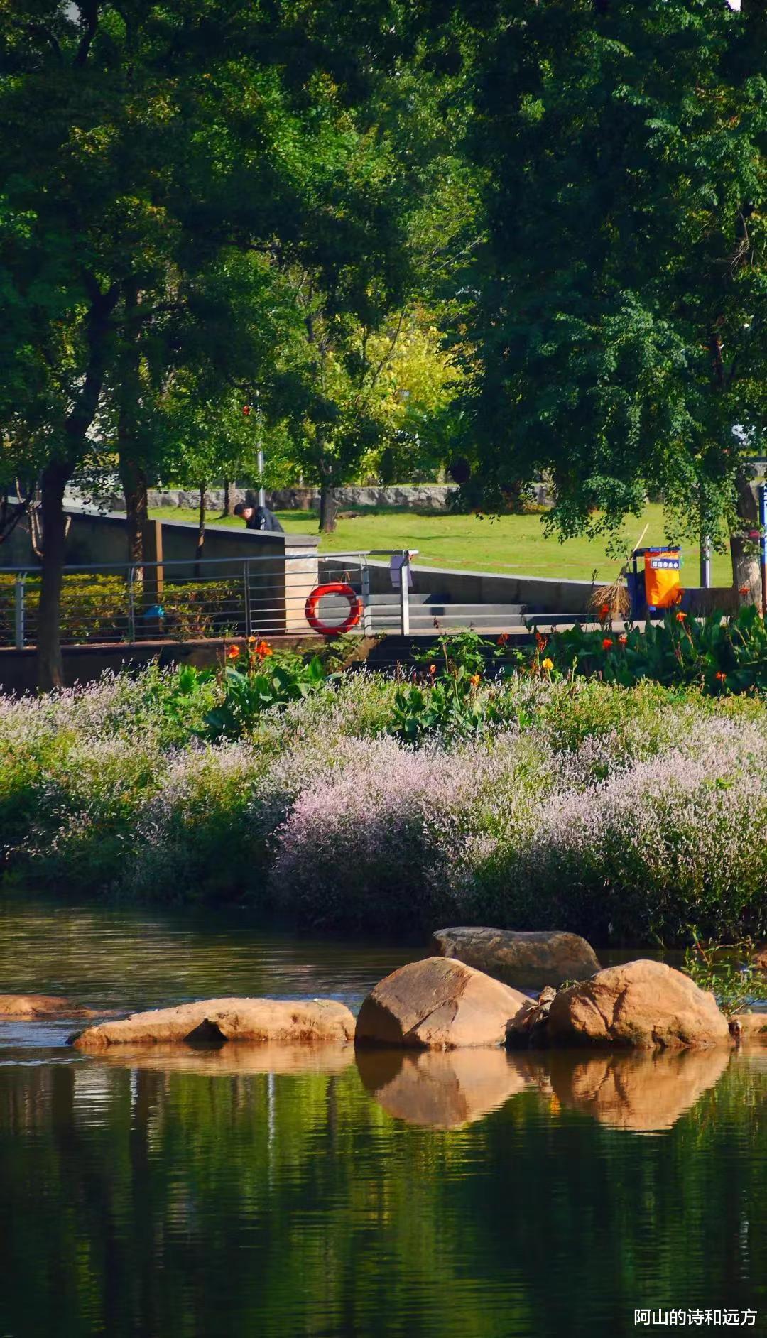 往前走一段,圭塘河拐了一个弯,河道边有一个小水塘,塘边及一块坡地被围栏围住,这里养了一群鸭子和一只小狗。坡地上搭了一个小棚子和一个狗窝。那只小狗老远就看到我了,又蹦又跳的,可惜它被铁链套住了,不然,一定会跑到我面前来欢迎的。它一点都不自由,也渴望有人在旁边,群鸭有伙伴,而它没有伙伴,显得好孤单,被限制在这里日晒雨淋的,虽然主人给了它吃的东西,也有自己的窝,但感觉它好可怜。我多次唤它逗它,它很友好,不停地摇着它的短尾巴。