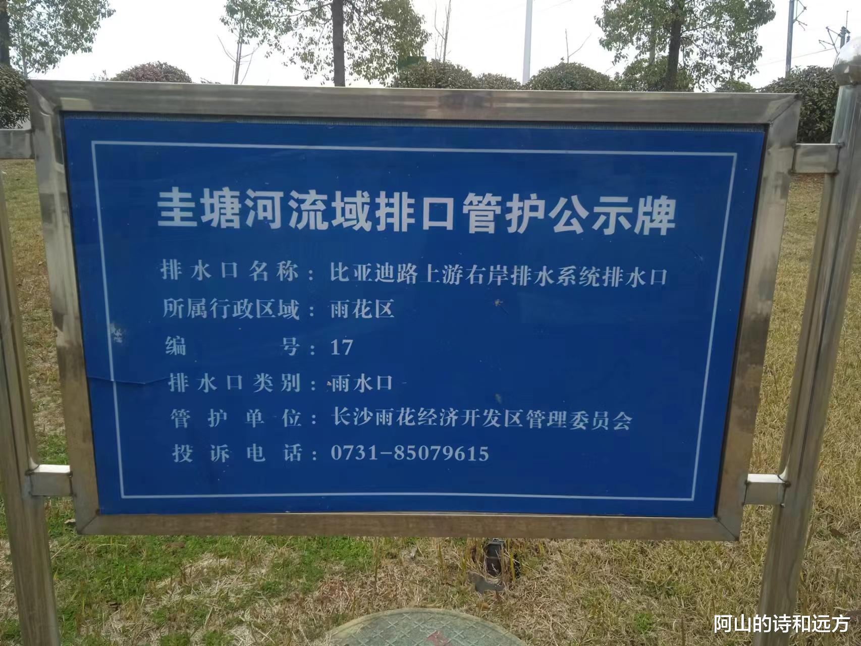 河道开始变得窄而深。河岸边不时出现圭塘河流域排口管护公示牌,几乎每隔两三百米就会看到一块这样的牌子。