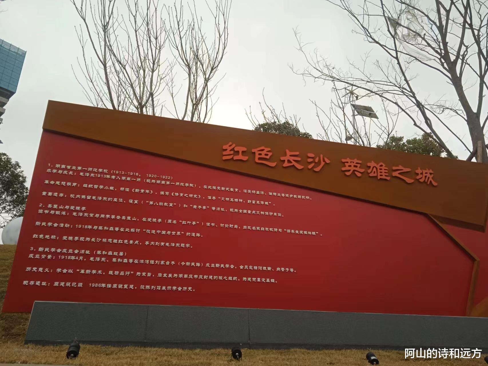 河畔乐园的临河面立着多块宣传牌子,主题是“红色长沙,英雄之城”,红色宣传牌上介绍了湖南省立第一师范学校、岳麓山与爱晚亭、新民学会成立会旧址、八路军驻湘通讯处、长沙抗日救亡运动等。