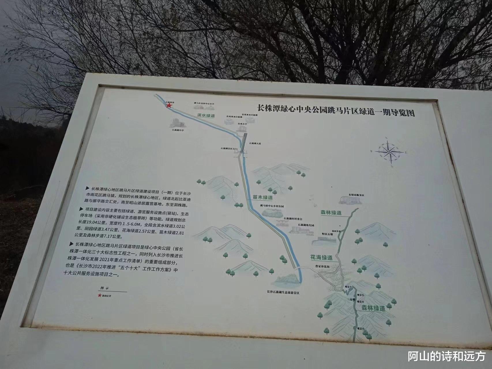 河岸的公路边,设置了“长株潭绿心中央公园绿道——滨水绿道”的户外广告牌,还展示了其一期导览图。从图上文字得知,一期绿道位于长沙市雨花区跳马镇,规划的长株潭绿心地区,绿道北起比亚迪与振华路交汇处,南至昭山途居露营基地,东至洞株路。绿道规划总长19公里多,宽1.6米到6米。