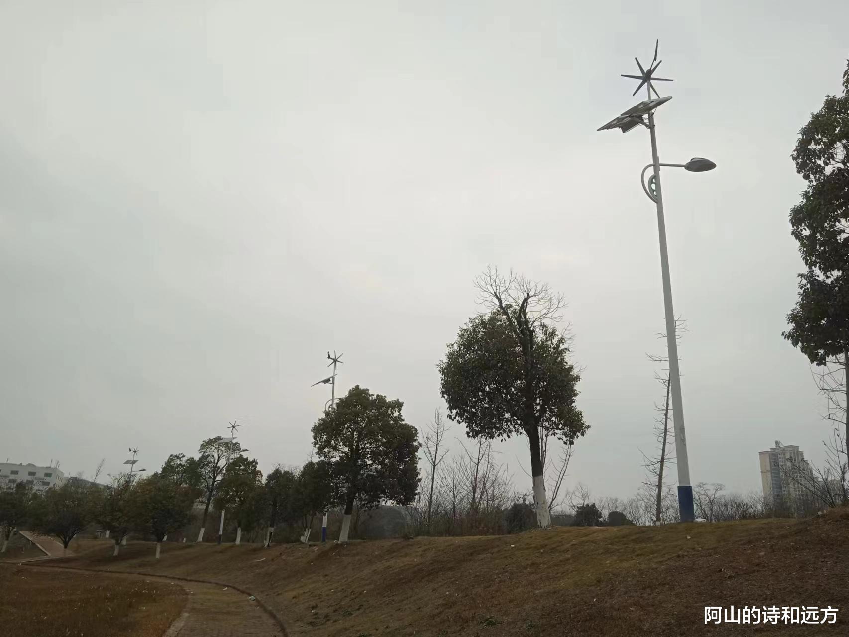 河堤上公路边的每一根路灯杆顶上都安装了小光伏板和小型风机,风吹来时,风机会随着风向转动。