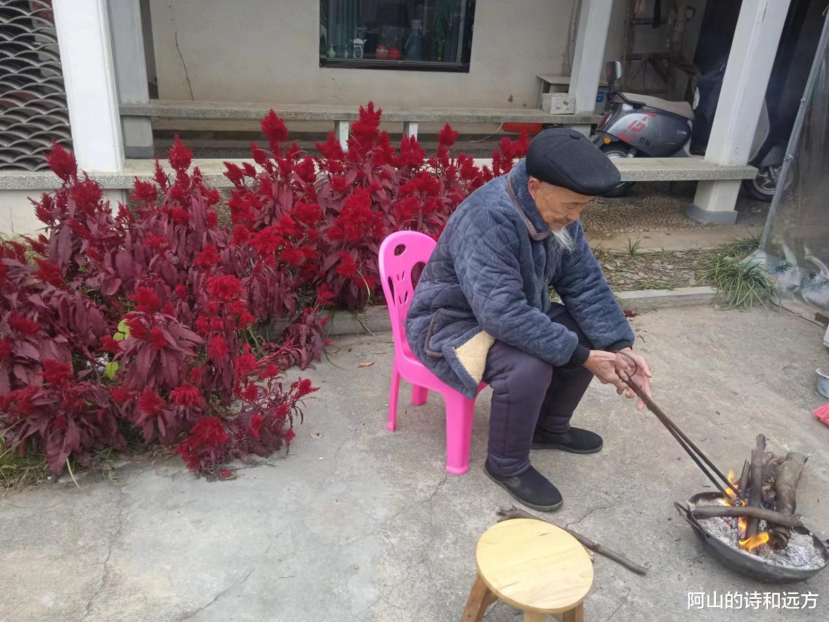 大公路边有一户人家,开着茶馆,院子里,一位八九十岁的大爷用一口铁锅烧着柴火烤,他身后盛开着一丛红色的花朵。