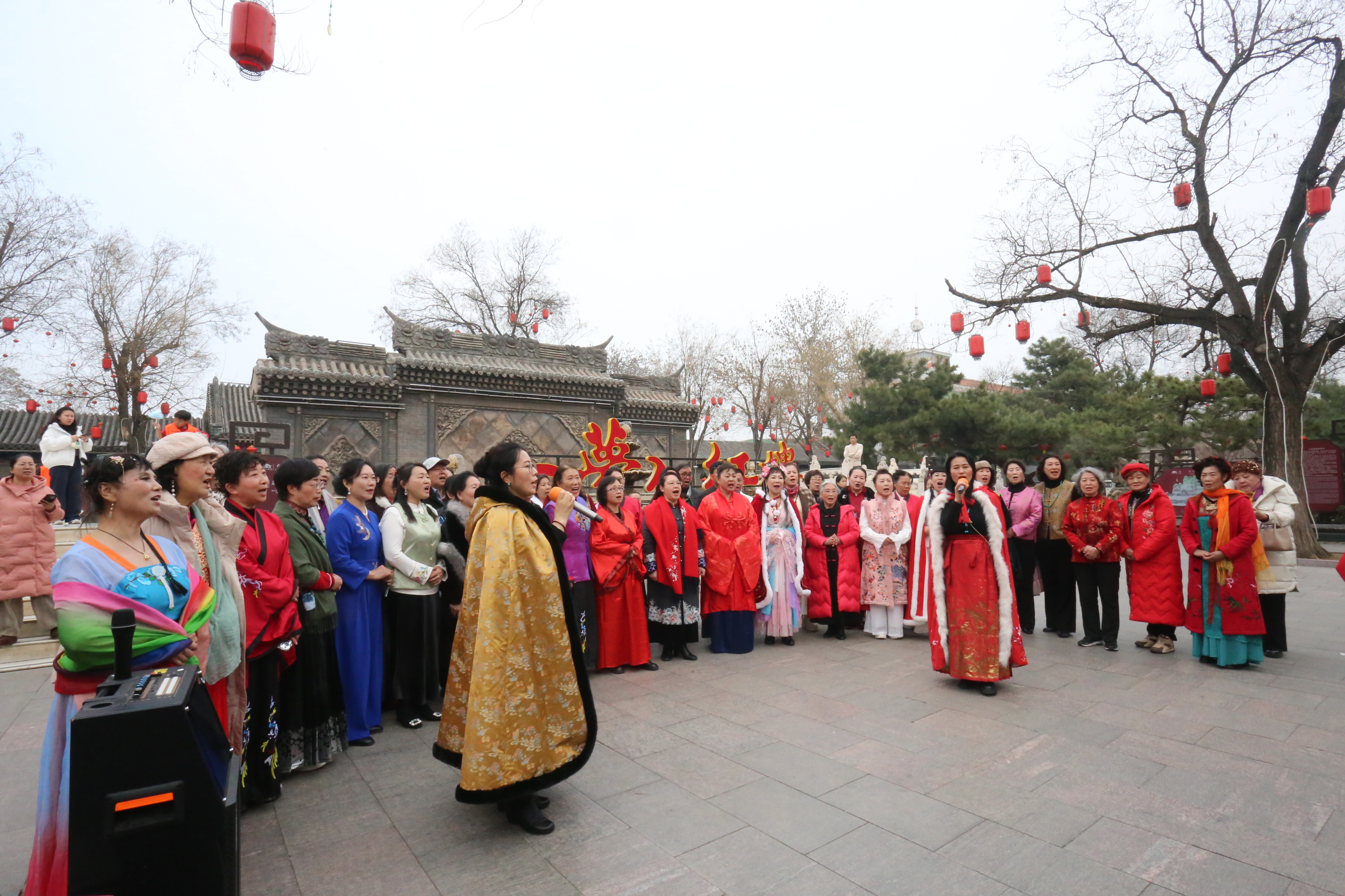 14时整,平日熙攘的宁荣街畔,几十数位华裳女子翩然而至。罗衣飘飘,裙裾轻扬,她们与荣国府朱门灰瓦、雕梁画栋的背景浑然一体。此次“宁荣街快闪”活动,系应荣国府景区管委会特别邀请,由中国经典音乐传习者郝龙先生组织乐友精心实施。在郝先生的引领下,乐友们并非简单亮相,而是以声传情,以曲入境。
