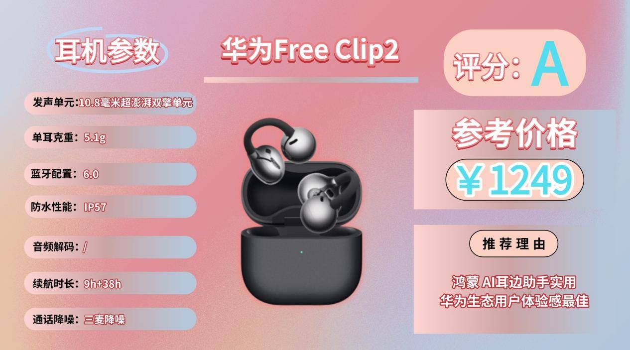 华 为 Fr ee Cli p 2 依旧主打轻巧设计,单耳 5.1g 的重量几乎感觉不到存在,柔韧的 C 型耳桥能自然贴合耳廓,不会在耳背形成硬压,长时间佩戴也不容易累。整体造型偏饰品风格,和配件搭配时也不显突兀,外观辨识度很高。声学部分搭载华为自研芯片与双擎发声系统,人声干净透亮,高频延展顺滑,听感舒展;开启空间音频后,追剧时能感受到明显的方向层次。低频则走沉稳路线,强调厚度但不强调冲击力,对节奏类音乐的氛围渲染稍显克制。功能方面,多设备流转与日常通话降噪表现出色,安静或办公室环境下体验很好,但在大风天气仍会捕捉到些许风噪。整体更适合喜欢轻量佩戴、注重解析力与空间感的用户。