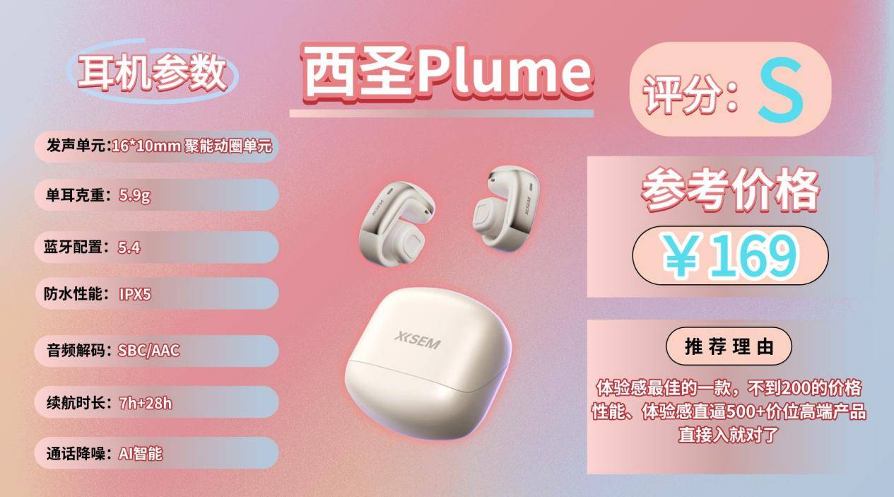 不同于同价位多数开放式耳机易掉线、延迟高,西圣Plume搭载蓝牙6.0芯片,连接极速稳定,支持60ms赛事级低延迟,音画完全同步,打游戏畅快无阻。Ai高清通话降噪精准收音,28小时超长续航加持,才一百多,直接吊打市面上千元级开放式耳机,性价比无敌!