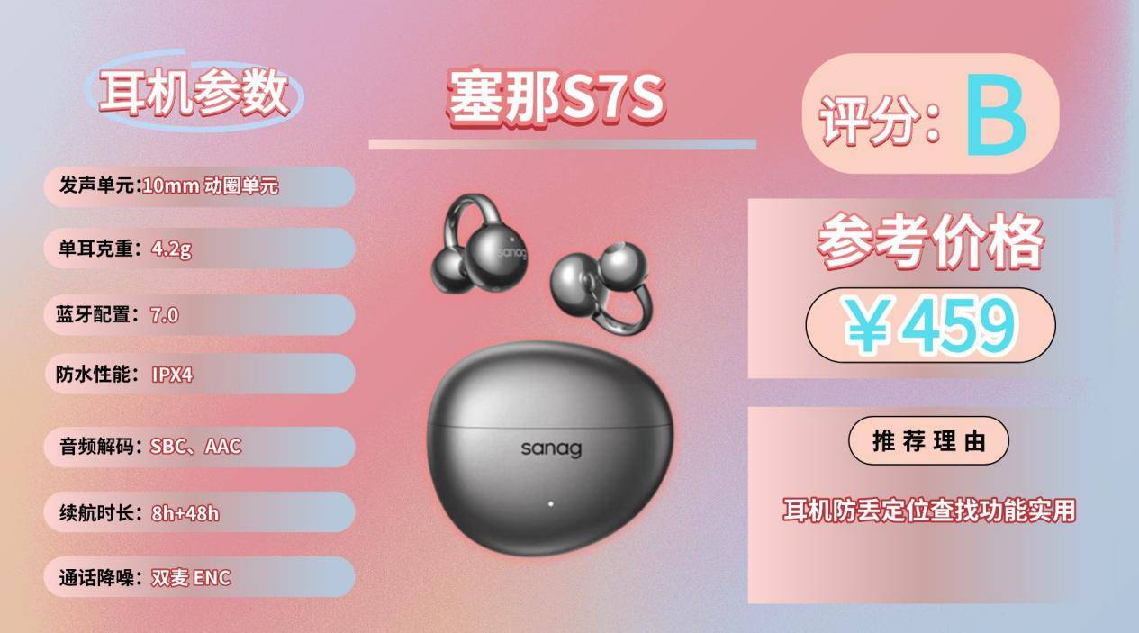 塞 那 S 7S 算是挺典型的一款。单耳重量大约 4g,实际佩戴时的存在感非常弱,挂上耳朵之后不像传统耳机那样有明显压迫,不过也因为结构比较轻柔,在快步行走或大幅度点头时偶尔会有轻微松动感,敏感耳型用户可能需要稍微调整位置。搭载的是一颗 10mm 动圈,说不上是那种“强刺激型”的调音路线,不会干瘪但整体仍属于偏柔顺的类型,不是暴力低频那一挂。