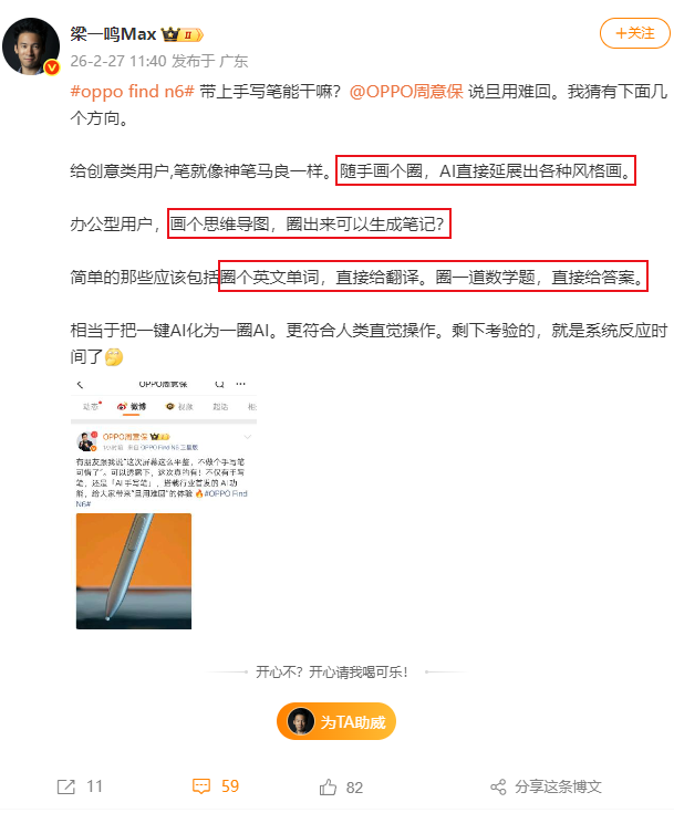 虽然官方还没有揭晓这支“AI手写笔”的具体妙用,但我们能想象一下这个场景:你在OPPO Find N6平整的大屏上随手画了一个流程图,AI把它变成了结构清晰的思维导图;你在会议纪要上圈了一个待办事项,AI自动把它同步到日程并设置了提醒;你在哈苏四摄拍下的照片上圈出一个人,AI问你“要不要把这张照片发给他”。