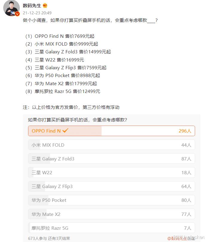 临近年末,倘若想趁此时机更换手机,我更建议各位旗舰手机用户选择折叠屏手机,因为如今各家主流手机厂商都相继推出了自家的折叠屏旗舰,兼顾实用性与美观性,今年年底确实是个不错的换机时机。在网络上也有数码博主发起了投票:如果你打算买折叠屏手机的话,会重点考虑哪款呢?可以看到,前段时间发布的OPPO Find N获得了一边倒的支持率。