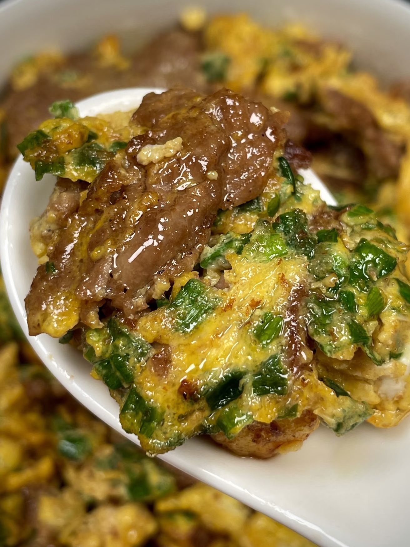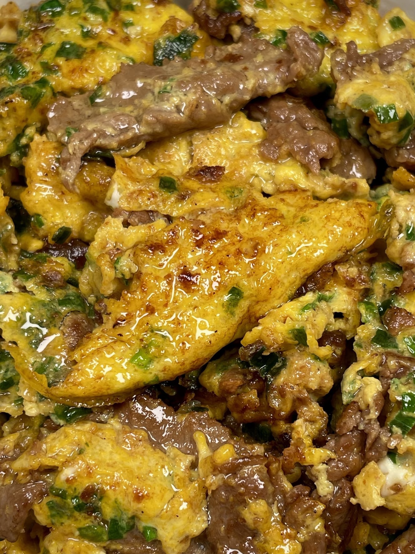 刚出锅的牛肉滑蛋,色泽金黄,牛肉嫩滑,蛋花软嫩,葱花的香味点缀其间,让人垂涎欲滴。每一口都是满满的幸福感,牛肉的鲜美与蛋的嫩滑在口中交织,让人忍不住一口接一口。这道菜不仅美味,而且营养丰富,牛肉富含蛋白质,鸡蛋是优质蛋白质的来源,葱花还能提供一定的维生素和矿物质。