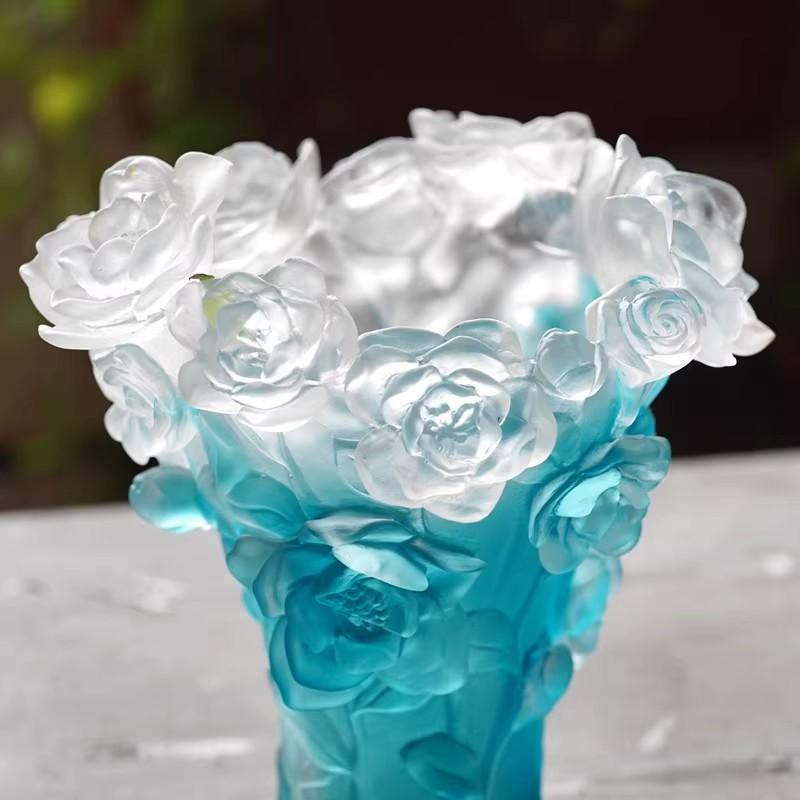 山茶花,在中国文化中也有着丰富的象征意义,它代表着高洁、谦逊、坚韧和希望,深受文人墨客的喜爱。将山茶花元素融入琉璃花瓶的设计中,不仅赋予了花瓶更丰富的文化内涵,也让传统的琉璃工艺焕发出新的生机与活力 。