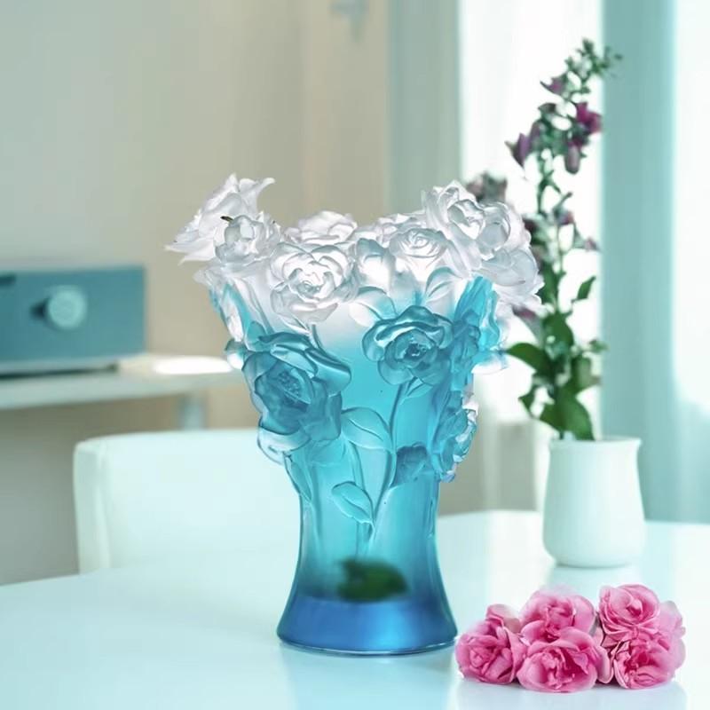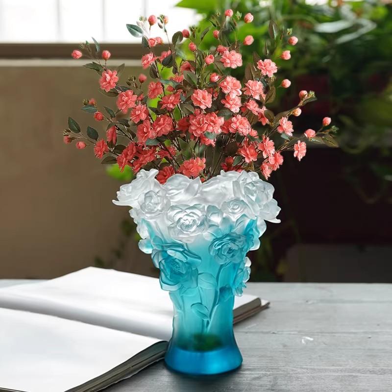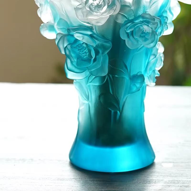 就拿烧制环节来说,火候的把握至关重要,温度过高或过低都可能导致作品失败,成品率仅有 70%。而且,古法琉璃不可回收,一旦出现瑕疵,之前所有的努力都将付诸东流。也正是这种独特的工艺和极高的制作难度,使得每一件古法琉璃制品都独一无二,世间难寻两款完全相同的琉璃,这也赋予了它独特的艺术魅力和收藏价值。 这件古法琉璃山茶花花瓶,更是凝聚了工匠无数的心血与智慧,每一处细节都彰显着古法琉璃工艺的独特韵味。