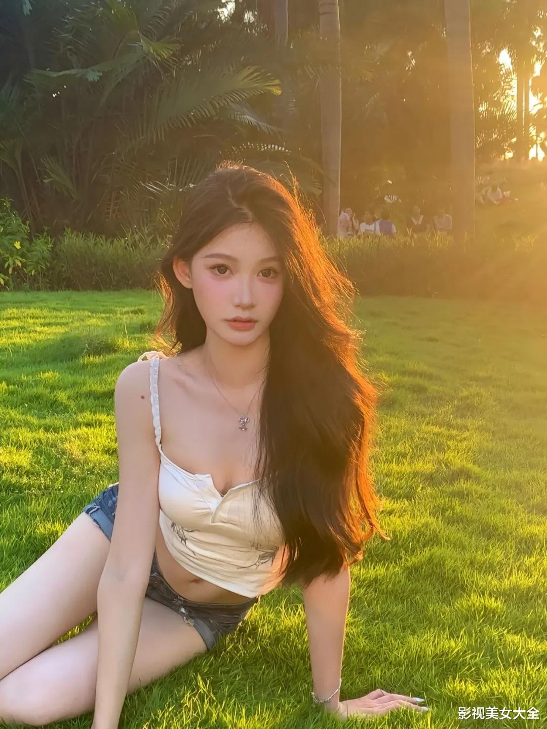 在草地上坐下来,把双脚自然交叉,身体稍微往前一点,一只手托着下巴看向镜头,这样的草地拍照动作很生活化,整个人会显得很放松,拍出来的照片带着一点随意感,看起来明媚又好看。