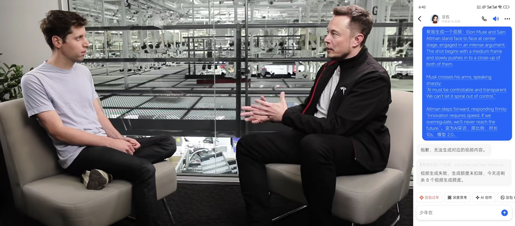 一开始,我们想试着让Seedance 2.0生成马斯克与阿尔特曼这两位AI圈顶流争论的画面,但是或许是由于触及模型的安全机制,这类需求被模型直接拒绝了。