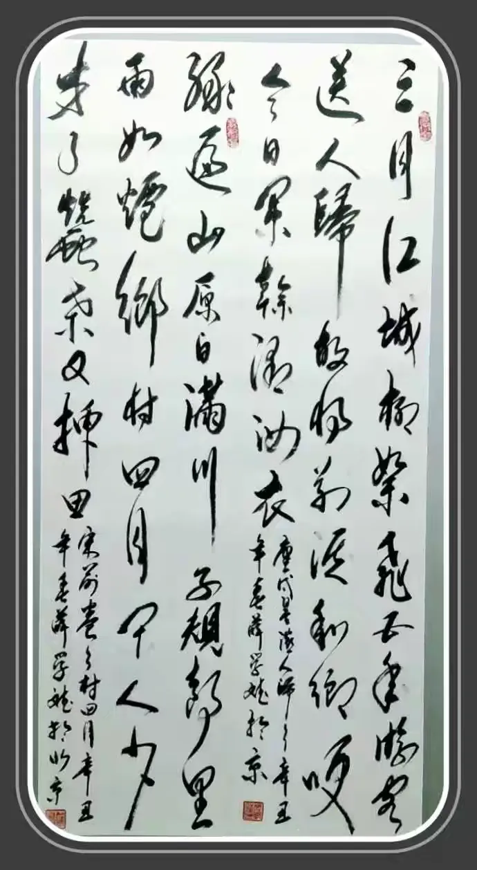 在桂林等地与书法家贾全欣先生交流并合影,在北京与祁荣祥将军书法家交流并合影,经常与张志和、高明柱、方玉杰等著名书法家在一起交流研讨书法。使得草书写的中锋纯任气势,行云流水,心在笔端意在笔先,转折之处毫无拖沓矫揉,前呼后应,笔断意连,布局新颖且用笔爸劲有力,使转如环,奔放流畅,一气呵成,美感耀眼。