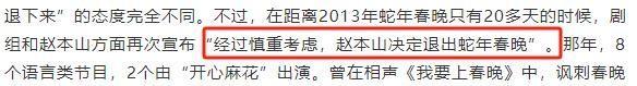 但2013年,赵本山在距离蛇年春晚只有20多天的时候,突然宣布退出了。