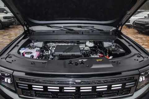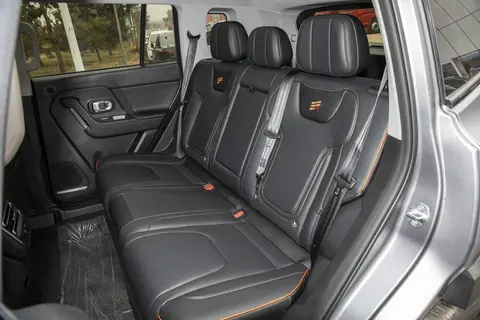 就算电池没电了,发动机介入也特别平顺,不看仪表盘几乎感觉不到发动机已经启动。官方标称的WLTC馈电油耗是6.56L/100km,我实测了一周馈电行驶,市区拥堵路况下油耗大概6.5L/100km,高速120km/h巡航油耗在7.2L/100km左右,这个油耗表现对于一台车重接近2吨的硬派SUV来说,已经相当优秀了。高速行驶时的动力储备也很充足,100km/h再加速超车,深踩油门就能感受到源源不断的动力,超车干净利落,完全不用犹豫。官方标称车速可以达到200km/h,我在高速上试到140km/h,车辆依然很稳,没有发飘的感觉,方向盘的指向性也不错,虚位很小,变道时很有信心。