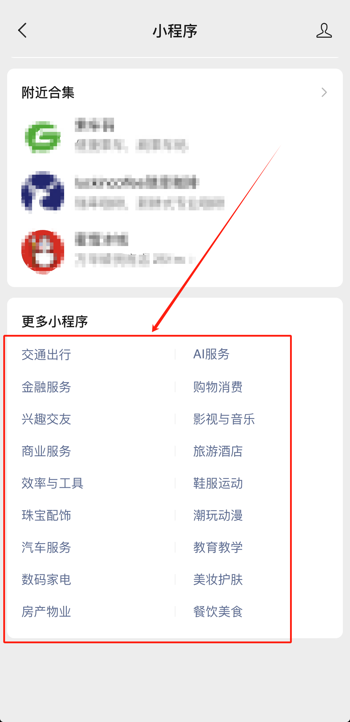 此时,我们会看到类别比较全的小程序,比如“交通出行”、“AI服务”、“金融服务”、“购物消费”、“兴趣交友”、“影视与音乐”等。