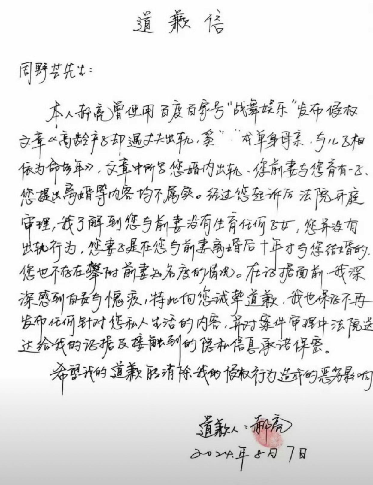 一切反转始于2024年8月。周野芒连甩两封造谣者的道歉信,白纸黑字击碎谎言。第一封信直接声明:“您与前妻没有生育任何子女。”——彻底撕下奚美娟“单身母亲”的标签。原来,当年她在月子期间离婚,周野芒被全网怒骂“抛妻弃子”,而奚美娟却凭此收割无数同情。