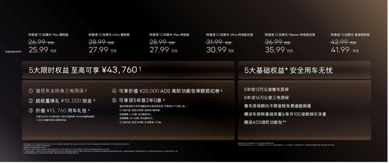 2025年10月28日,备受瞩目的阿维塔12四激光版正式上市。这款被誉为“最美华系车”的智能轿车以官方指导价26.99万元至42.99万元,以及权益后到手价25.99万元至41.99万元正式进入市场。作为阿维塔与华为六年合作的最新成果,这款车型不仅以华为乾崑技术为核心技术驱动,还在设计美学和智能化体验上树立了行业新标杆。发布会上,华为常务董事、终端BG董事长余承东为这款车倾力推荐,充分展示了双方合作的深厚实力。