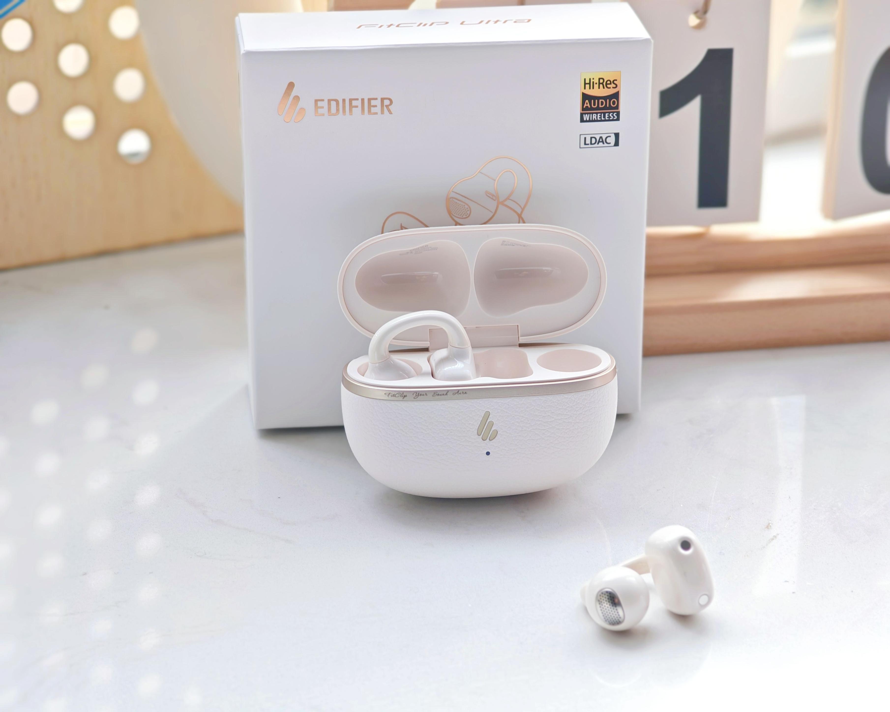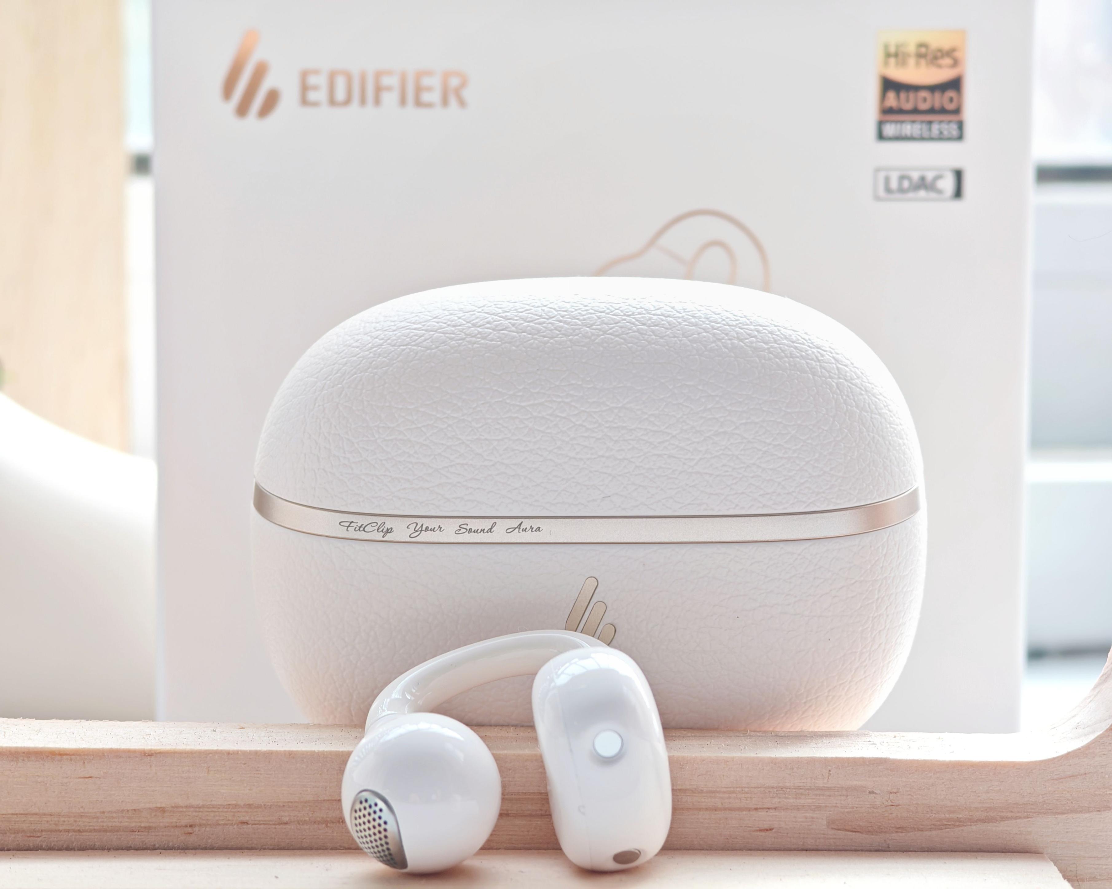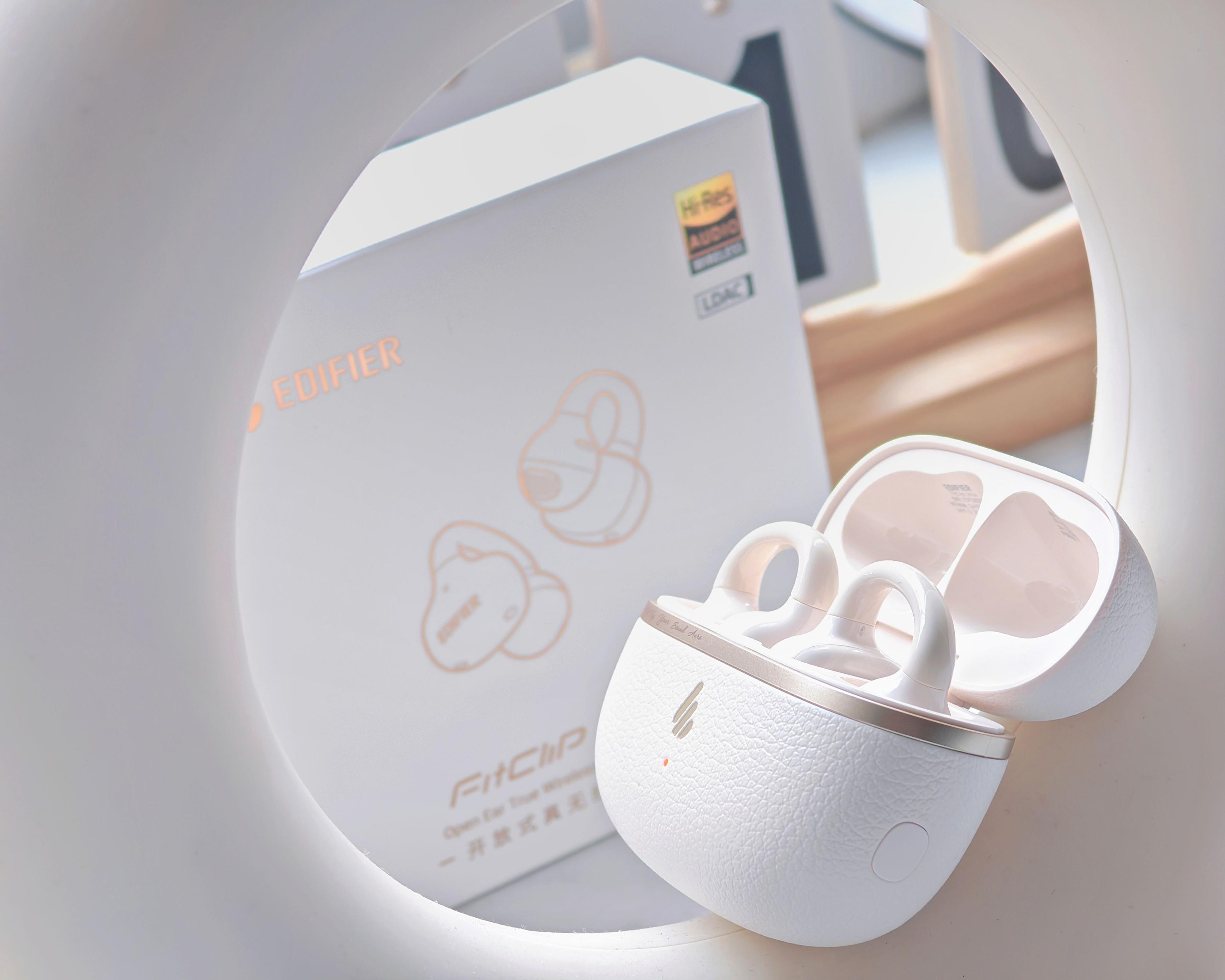 漫步者FitClip Ultra的包装采用极简主义设计,外盒以纯白为底色,仅印有烫金品牌LOGO与产品型号,抽拉式结构赋予开箱仪式感。包装盒标注“Hi-Res Audio”金标认证,彰显其音质定位。