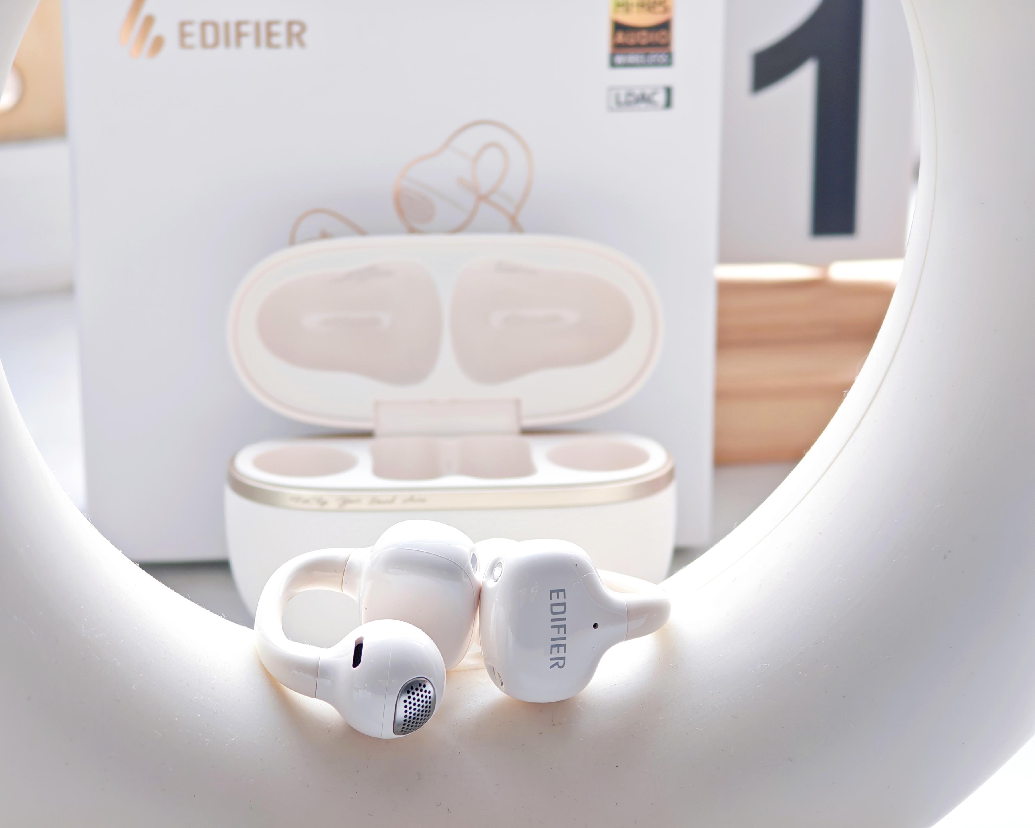 漫步者FitClip Ultra搭载了12mm大尺寸PU+纸复合振膜单元,通过Hi-Res Audio认证。作为开放式耳机,FitClip Ultra在保持耳道通透的同时,通过“定向传声技术”减少漏音,能够做到半入耳式听感。