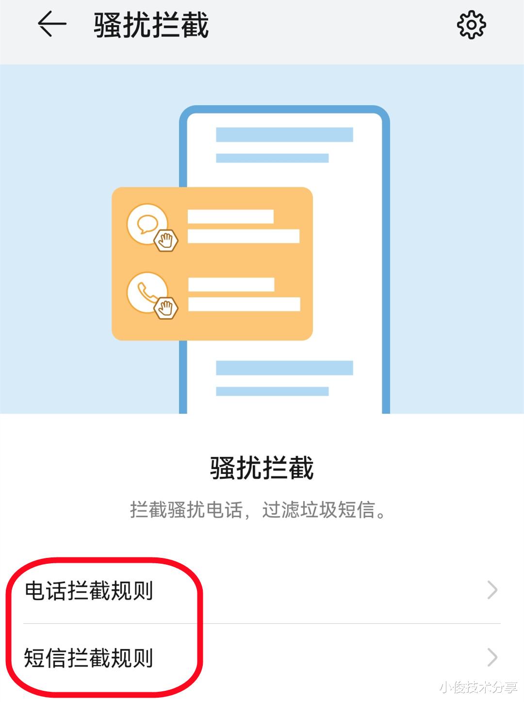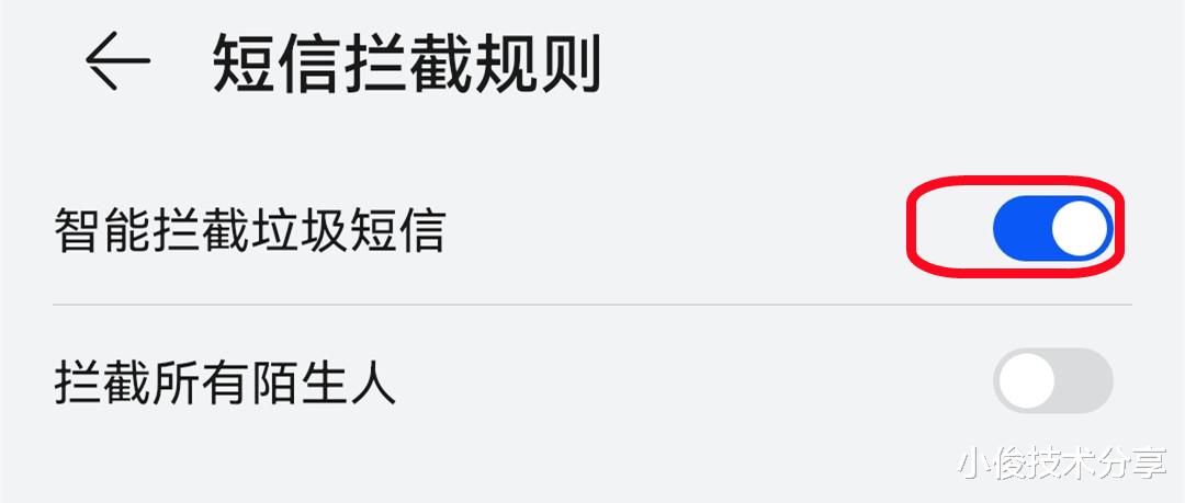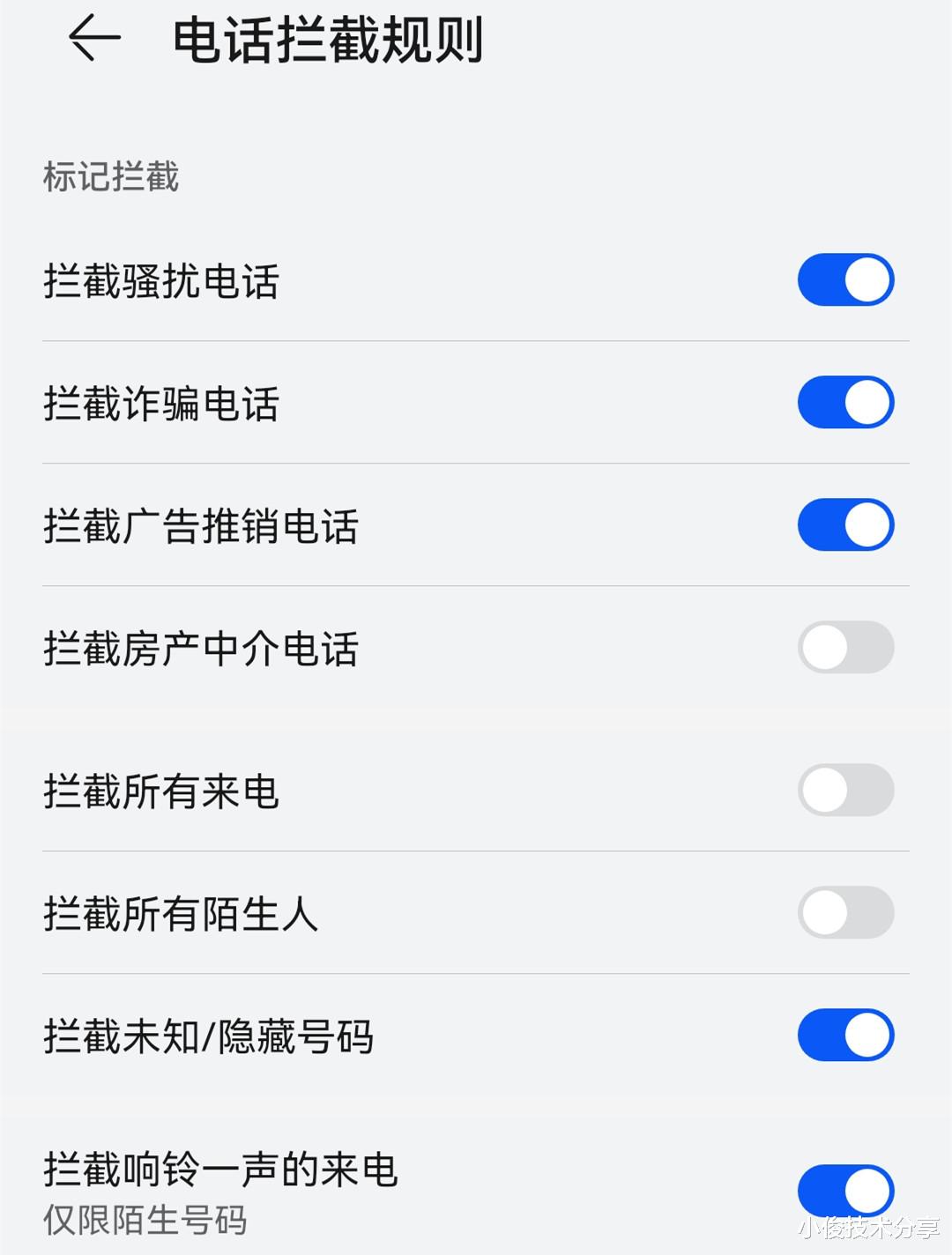 下方还有一个叫拦截响铃一声的来电,这个也要开启,这样才能避免陌生电话频繁骚扰我们,好了,开启这几个地方之后。接下来咱们返回一下,设置短信拦截规则,把拦截垃圾短信,拦截广告短信这两个开关打开,明白了吧?