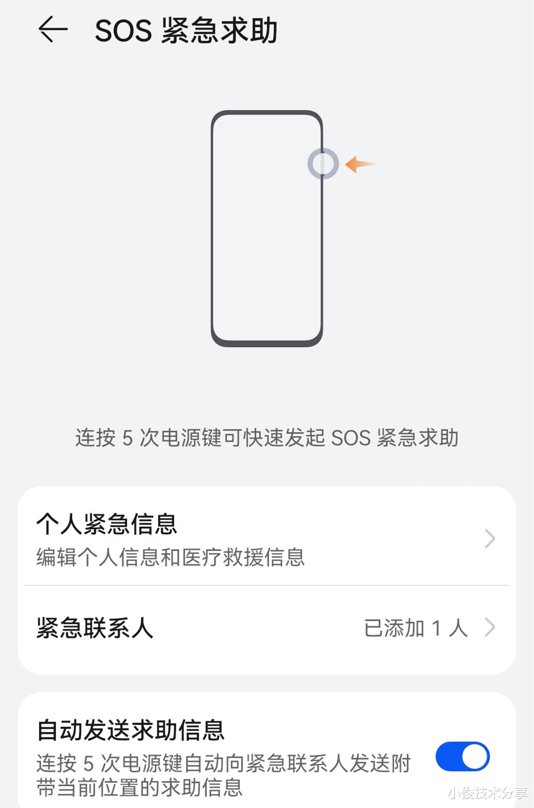 那么这个功能如何开启呢?非常简单,只要连续按5次电源键就可以了!当我们遇到危险,不方便拿出手机时,你可以偷偷的连续按五次电源键,这样就能第一时间,让紧急联系人知道我们的具体位置,从而找到我们。