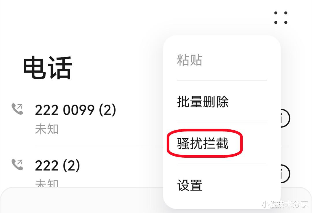 首先咱们先来解决一下,如何拦截骚扰电话和恶意短信,打开你手机上的拨号键,点一下右上角的四个点,这里面有一个叫骚扰拦截的。看到没?