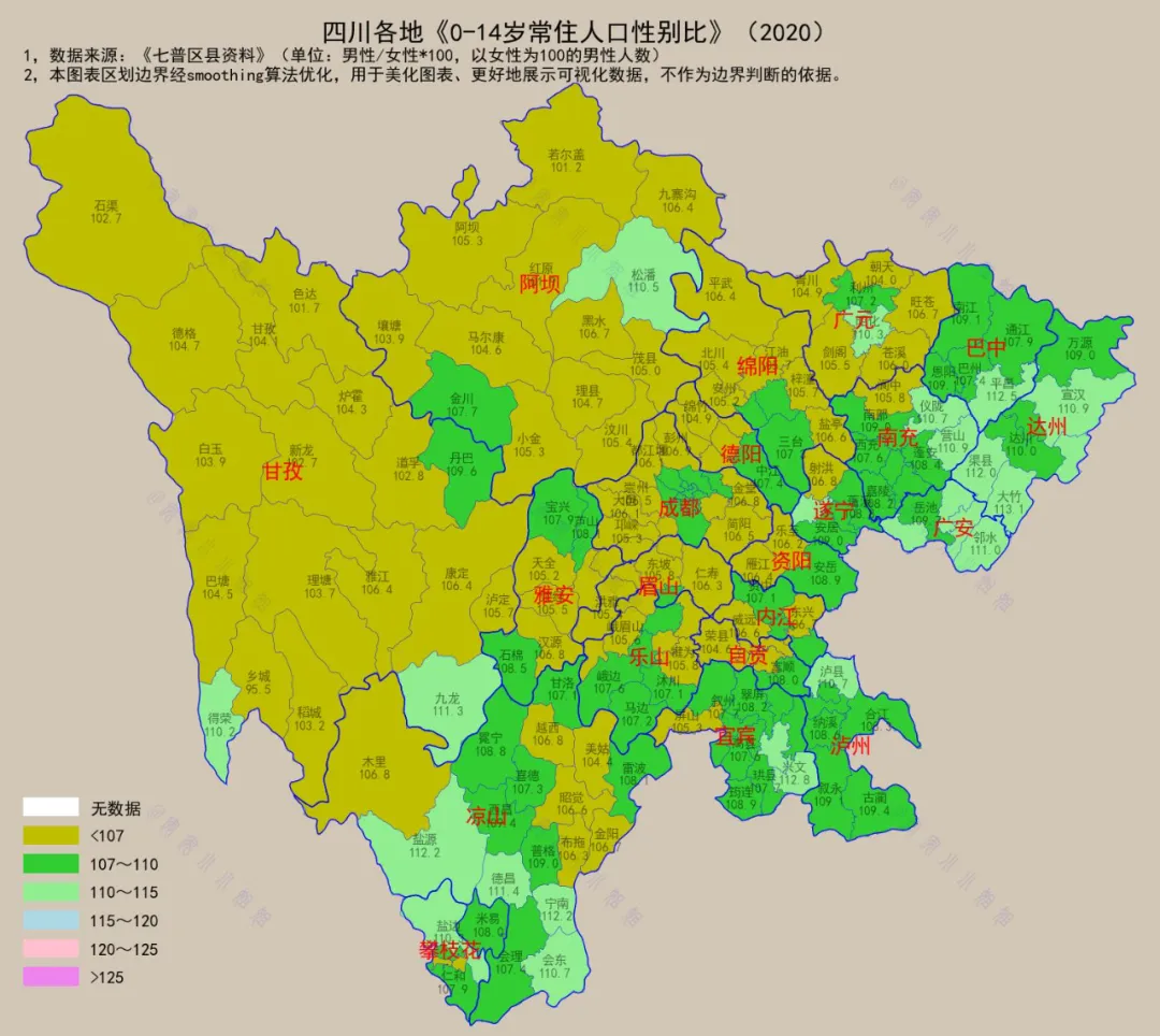 一段时间以前,我们分享过重庆以区县为统计单位的0-14岁常住人口性别比数据。数据显示,除永川外,其余重庆的37个区县,性别比均在115:100以下。四川各区县的情况,会不会比重庆好一些呢?