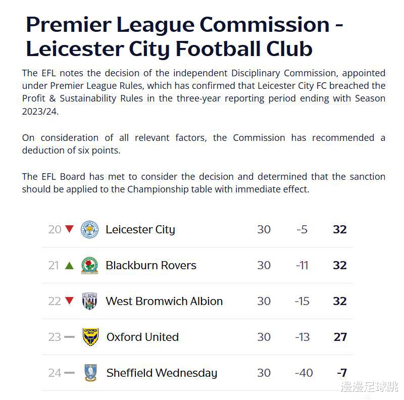 一纸官方公告,让英格兰足坛再次震动。北京时间2月6日,英格兰足球联赛(EFL)正式宣布:莱斯特城因违反盈利与可持续发展规则(PSR),被扣除6个英冠联赛积分。尽管违规发生在2023-24赛季,且莱斯特城当赛季已经完成升级,但财务问题违规事实确凿,“秋后算账”那不跑不了的,处罚即刻生效,不设缓冲期。