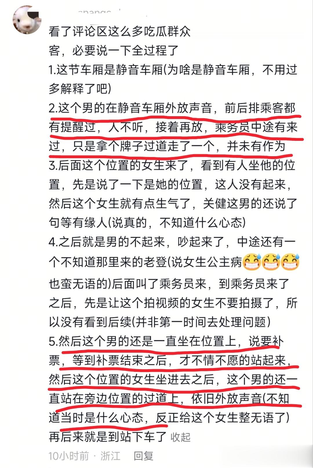 期间乘务员也有来过,但只是拿牌子举了一下就离开了,并没有对他外放声音进行处置。