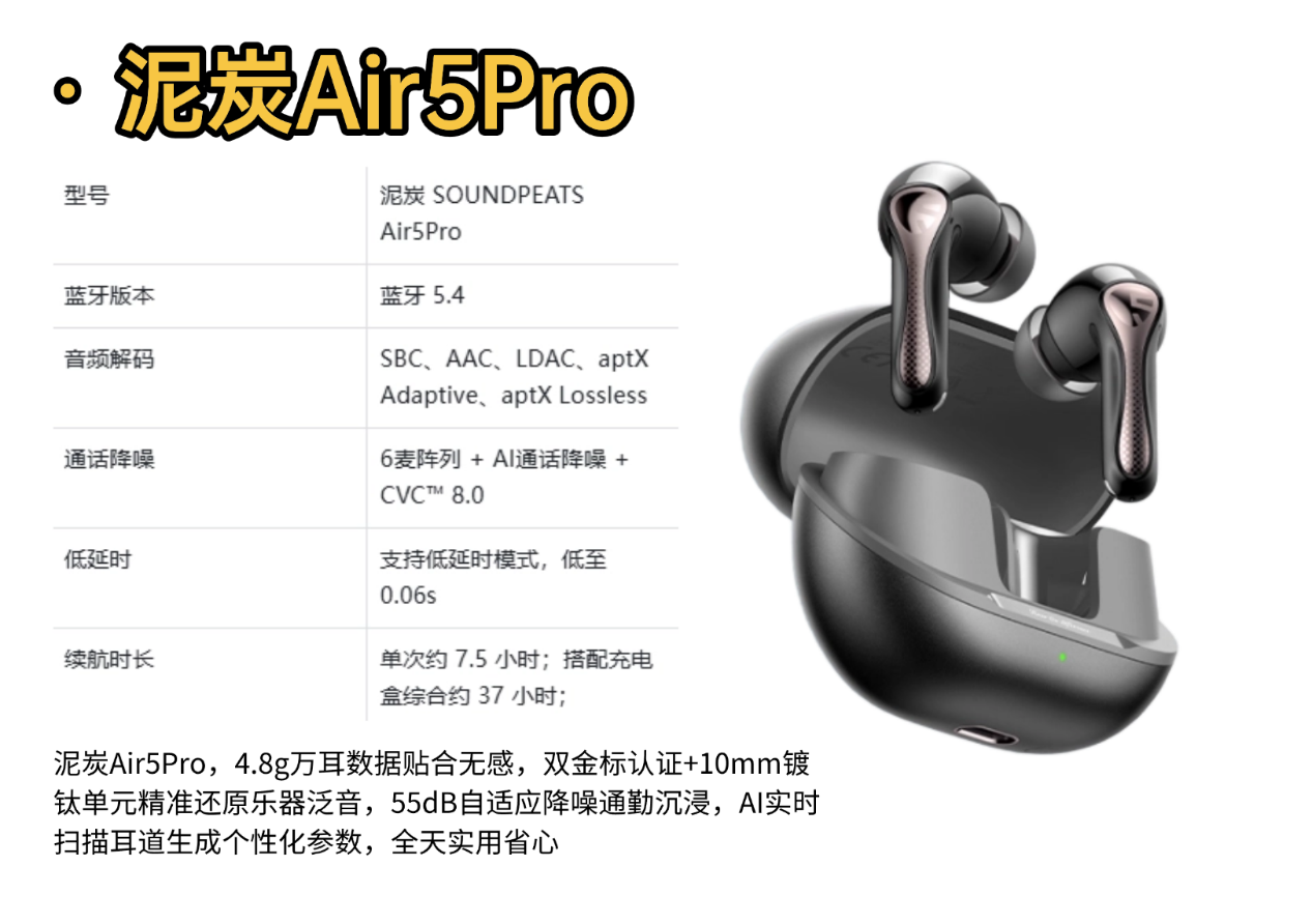 结论:适合追求极致降噪和音质细节的用户,4.8g万耳数据贴合无感,双金标认证+10mm镀钛单元精准还原乐器泛音,55dB自适应降噪通勤沉浸,全天实用省心