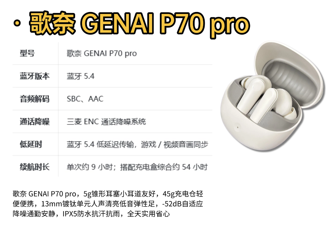 二、入耳式降噪耳机推荐1、歌奈 GENAI P70 pro