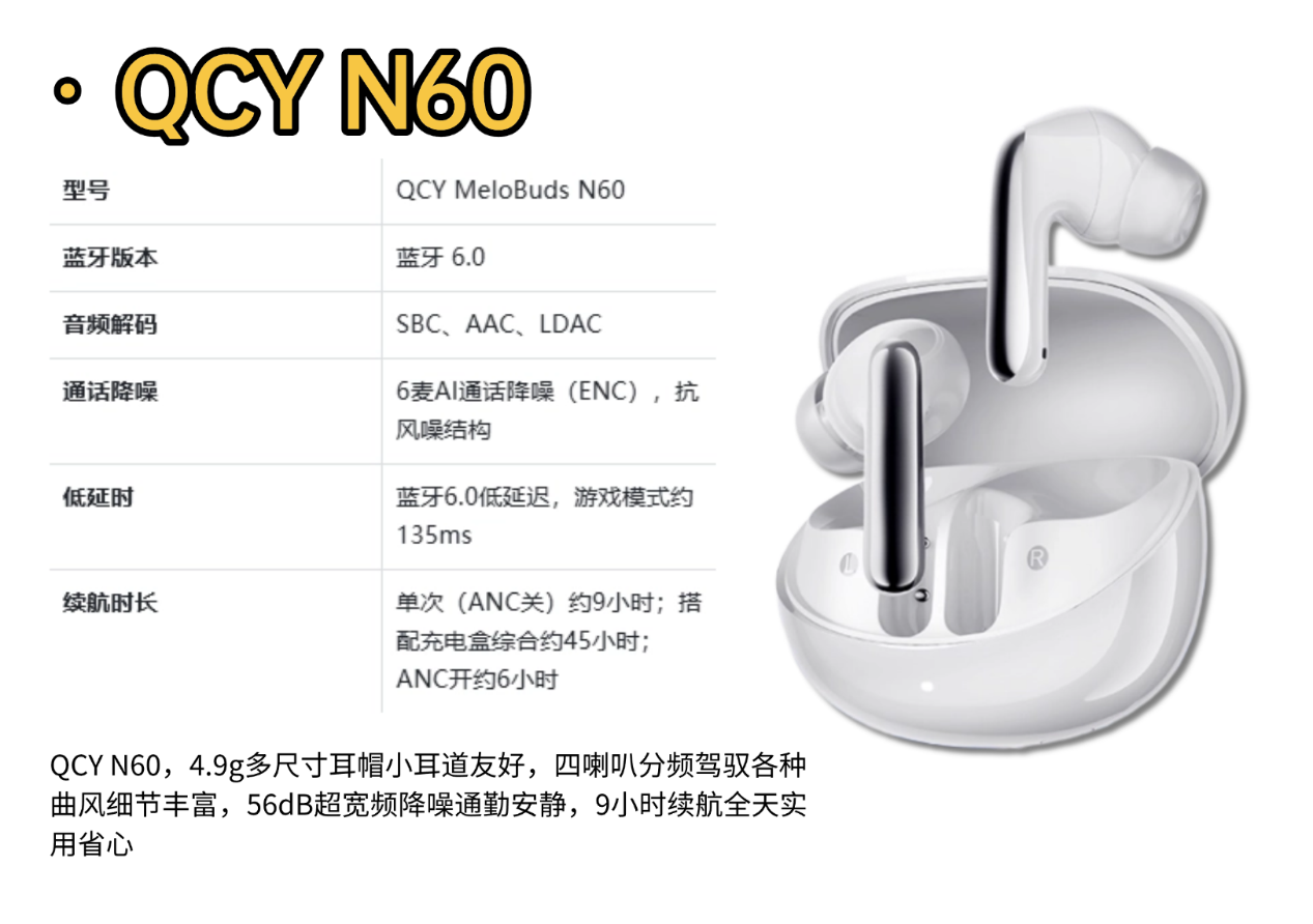 结论:适合追求深度降噪和音质细节的用户,4.9g多尺寸耳帽小耳道友好,四喇叭分频驾驭各种曲风细节丰富,56dB超宽频降噪通勤安静,9小时续航全天实用省心