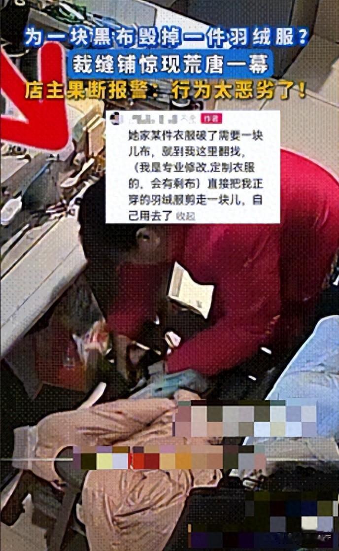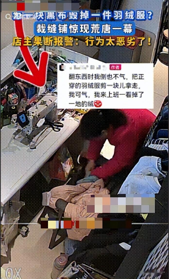 一位阿姨趁改衣店无人看管,翻找碎布未果后,竟直接拿起剪刀剪下店主羽绒服上的布料,揣入怀中匆匆离去。这段看似微小的插曲,却引发超10万网友激烈讨论,有人怒斥“缺德”,有人觉得“小题大做”,后续来了。