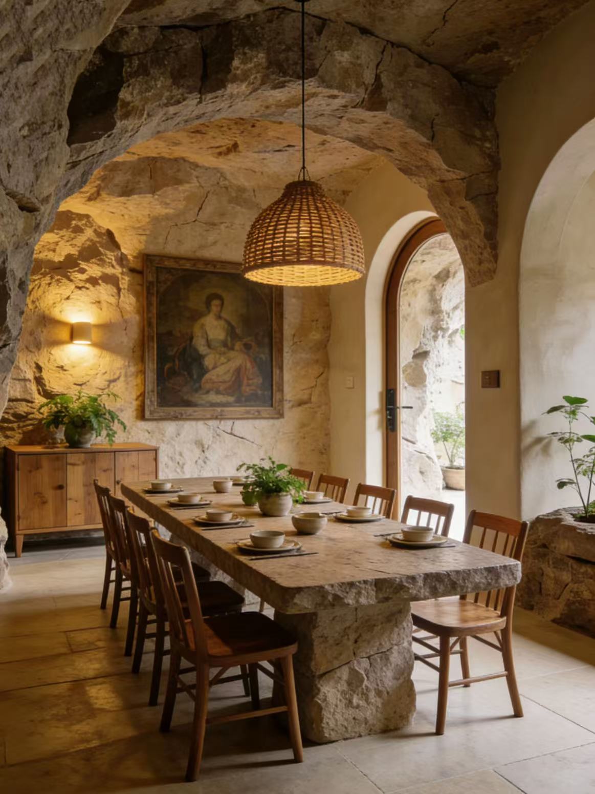 这些独特的居所,本身就是一件件大地的艺术品。置身其中,您会被周围粗犷而细腻的岩壁所震撼,每一道褶皱、每一根钟乳石都诉说着地球漫长岁月的故事。然而,现代设计的巧妙介入,让这份原始之美变得触手可及且温馨舒适。柔和的灯光勾勒出岩壁的轮廓,既保留了溶洞的神秘氛围,又营造出家的温暖。部分客房更拥有全景落地窗或私享露台,将壮丽的山河景色引入室内,让您在享受洞穴私密感的同时,也能与外部自然无缝连接。