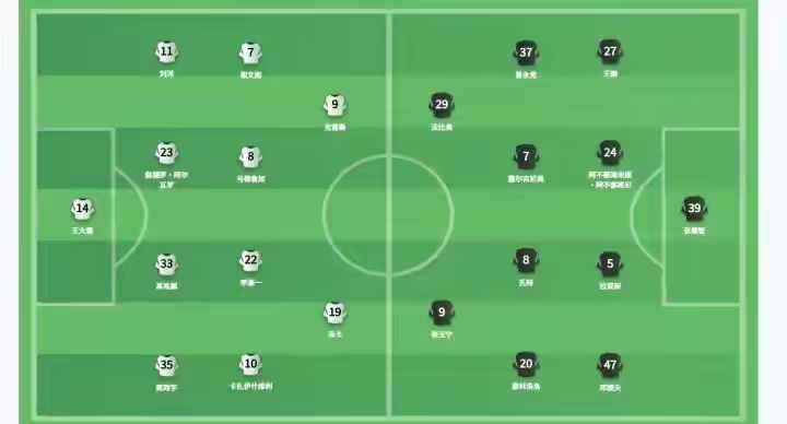 山东泰山首发为14-王大雷、11-刘洋、23-佩德罗·阿尔瓦罗、33-高准翼、35-黄政宇、7-谢文能、8-马德鲁加、22-李源一、9-克雷桑、19-泽卡、10-卡扎伊什维利,球队派出五外援最强配置,前场攻击群全员到位,主场拿下三分的意图十分明显。
