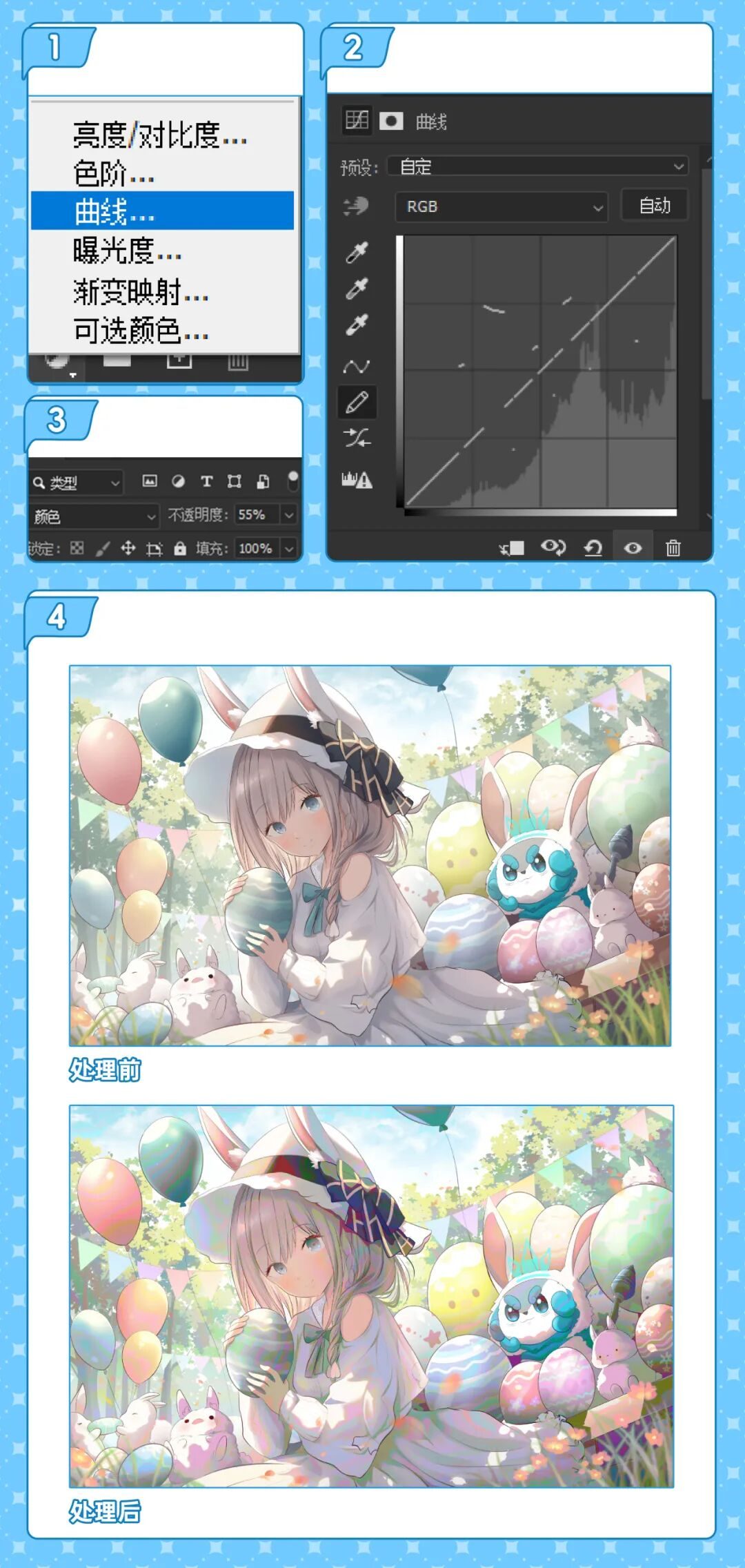 将画面复制一层,然后点击图层面板下方,选择创建【曲线】蒙版,曲线蒙版工具左侧的小画笔,在曲线上随便勾勒几下,接着调整蒙版图层的不透明度为25%左右,再把图层样式改为【颜色】,最后擦掉不需要藏色的地方,就能得到无痛藏色效果啦。