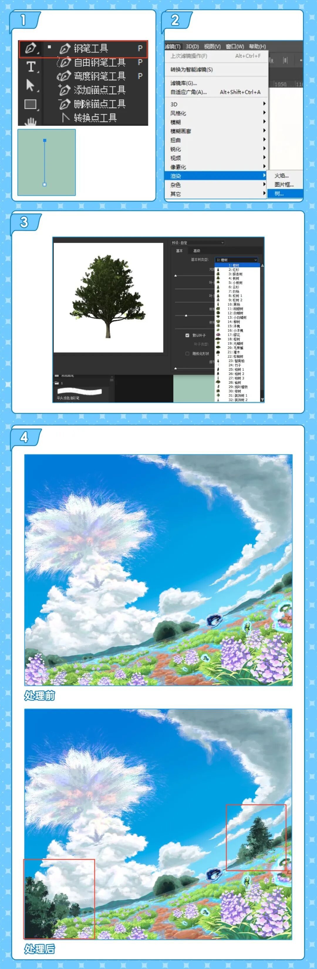 用钢笔工具,随意画出一条竖线当树干,然后点击【滤镜】-【渲染】-【树】,就可以快速生成一颗树啦,而且滤镜中自带多种样式选择,直接选一个合适的样式,再将树放在场景中,调整位置和修改一下颜色以及其他细节,真的不要太合适。