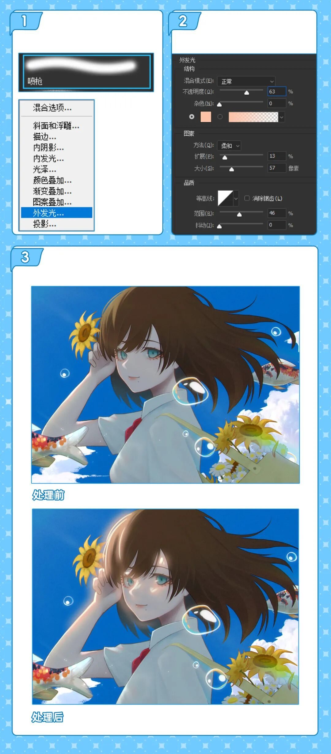 画二分时,选择喷枪笔刷后新建图层,接着打开【图层样式】,勾选【外发光】,然后在【外发光】设置里,混合模式为【正常】,不透明度设置100%,方法为【柔和】,大小在20像素左右,范围设置35%左右,最后选一个和你画面匹配的外发光的颜色,这样画亮面时就能拥有每一笔都自带高饱和色的明暗交界线了。