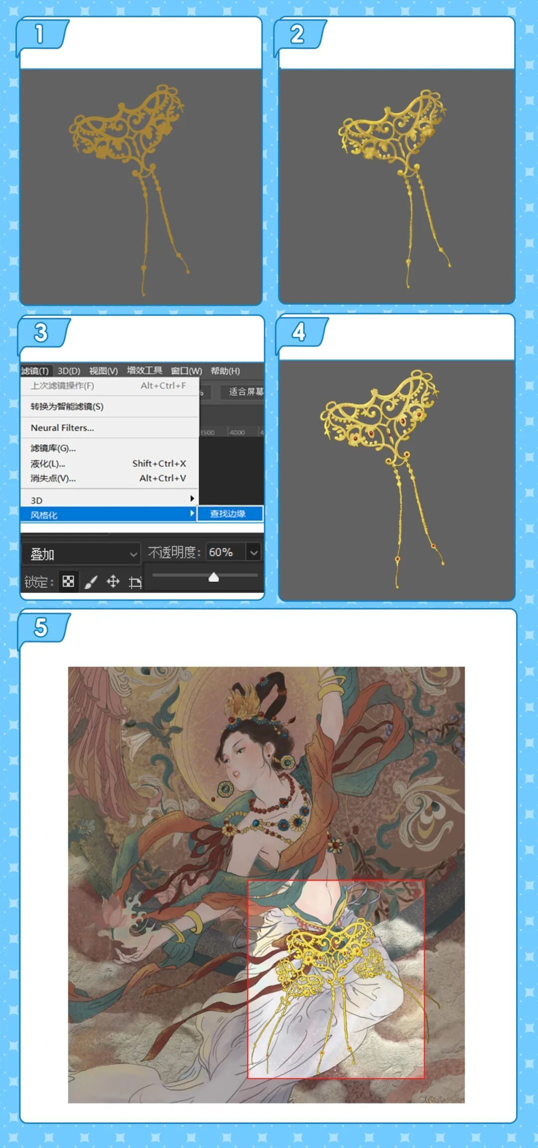 想让画面更有细节,精致的装饰少不了!先画出装饰的外轮廓剪影,再用质感笔刷添加斑驳纹理和高光,再复制一层,点击【滤镜】-【风格化】-【查找边缘】,再把图层模式改为【叠加】,降低一点图层不透明度,需要多少复制多少,最后细化效果就出来了。