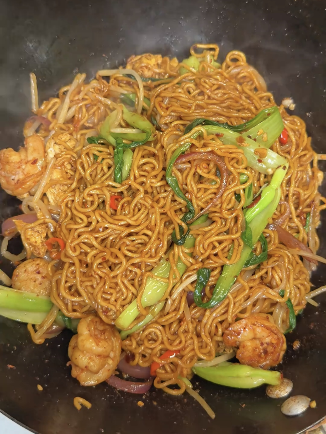 第二步:另起锅烧油,打入鸡蛋,把鸡蛋炒熟后盛起备用;接着锅中留住底油,倒入虾仁,炒至变色后倒入蒜末和小米辣,再把鸡蛋回锅,倒入青菜,洋葱和豆芽,炒至断生后再倒入泡面。
