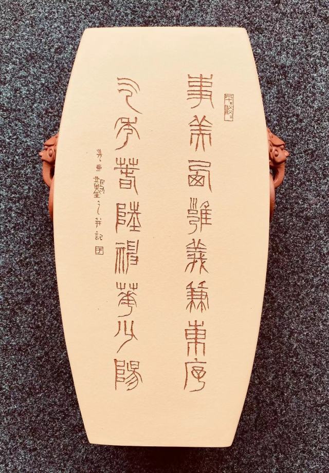 紫砂与篆刻,一柔一刚,在中华艺术的长河中交织千年。泥土与金石的对话,是金石艺术与陶艺的完美融合,方寸之间承载千年文化精髓。从明清文人壶的典雅铭刻,到当代艺术家的创新表达,紫砂篆刻始终在传统与变革之间寻找平衡。它以刀为笔,以泥为纸,在壶坯上刻画出刚柔并济的线条,既有篆书的古朴厚重,又具现代审美的灵动意趣。