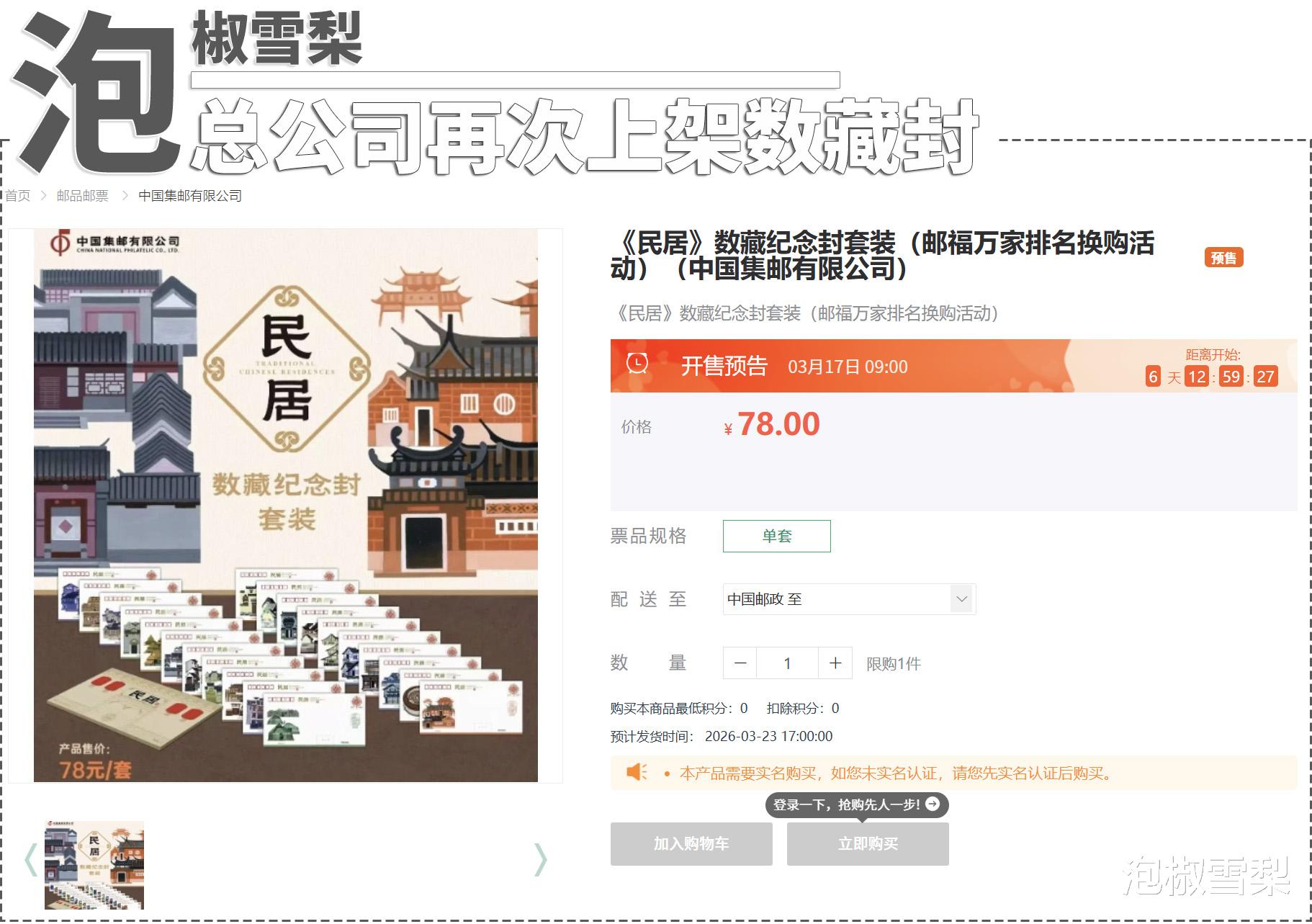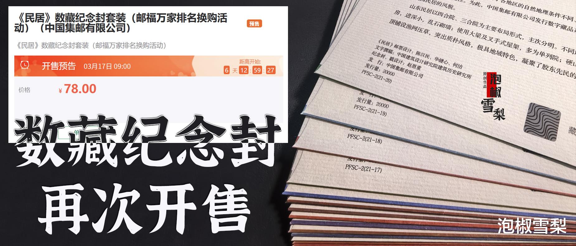 火爆一时的《民居》数藏纪念封再次上线了,中国邮政网上营业厅3月17日9时整开售,每人限购1套,还是初始发行价78元,按照最新的市场价400元计算,利润有322元。