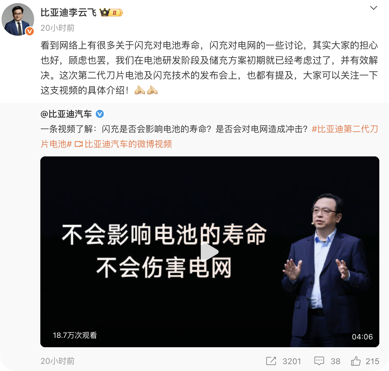 最近刷到好多人讨论比亚迪闪充会不会伤电池,闪充桩会不会对国家电网不友好,今天咱们就来分析一波。 第一个疑问:比亚迪闪充会伤电池、影响寿命吗?这个真不会,比亚迪有兜底怕什么,比亚迪第二代刀片电池直接做到了闪充和长寿命兼得。它有两个小妙招,既能让锂离子跑得飞快,又能通过智能热管理系统,把闪充产生的热量快速散出去,几乎不影响电池寿命,比第一代刀片电池还耐用。而且比亚迪起家就是做电池的,底气超足,现在还加码了质保,电池容量低于77.5%就免费换,电芯终身保修,要是真伤电池,哪敢这么承诺?电池安全性也拉满,完全不用操心。 第二个疑问:闪充桩会给国家电网添负担、不友好吗?更不会!每个闪充桩都配了超级快放的储能系统,存电的时候像个电能蓄水池,放电的时候又能稳定输出,既不会给电网造成压力,还不用额外投入大量资源改造电网。哪怕多车同时充电,每把枪都能保持稳定功率,再也不会出现车一多充电就变慢的情况,既对国家电网友好,还能让大家都享受到极致的充电速度。 简单说,比亚迪硬核闪充技术树立行业新标杆,放心用就完事儿!