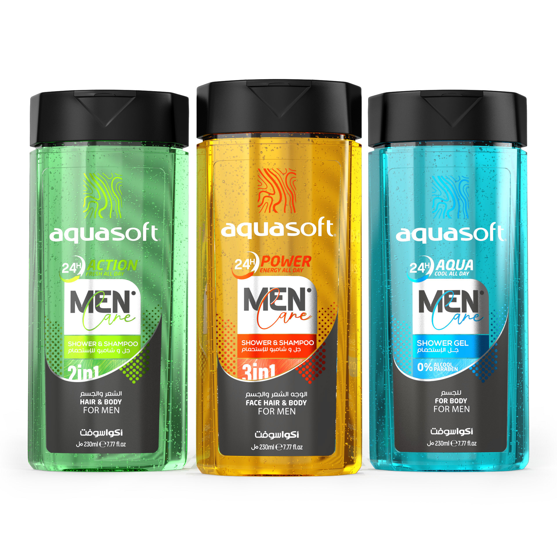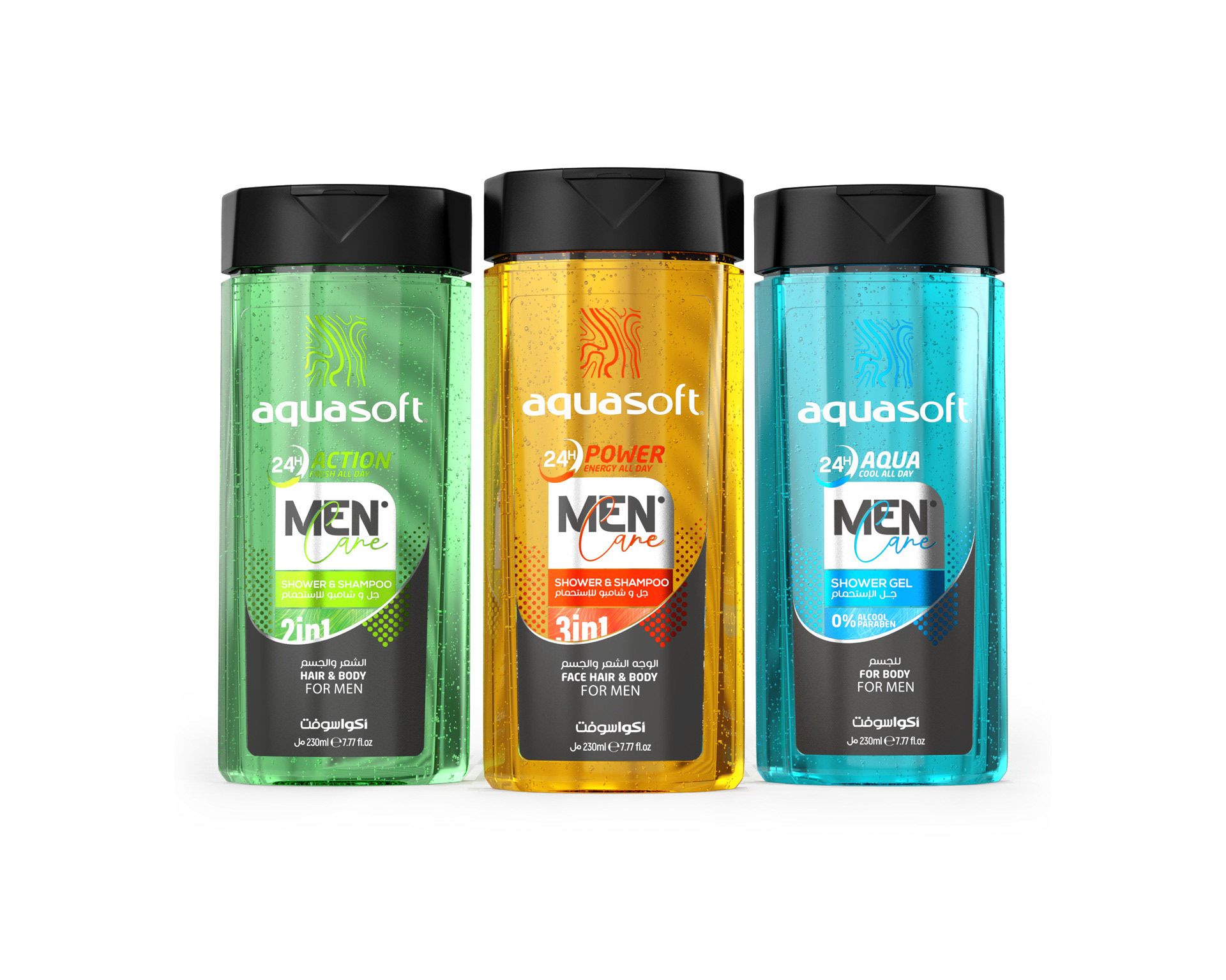Aquasoft的男士护理包装则走了一条截然不同的路线,将简约与科技感完美融合。瓶身线条硬朗流畅,以透明和半透明材质为主,搭配黑色瓶盖,形成鲜明的视觉对比,尽显男士系列的干练与大气。